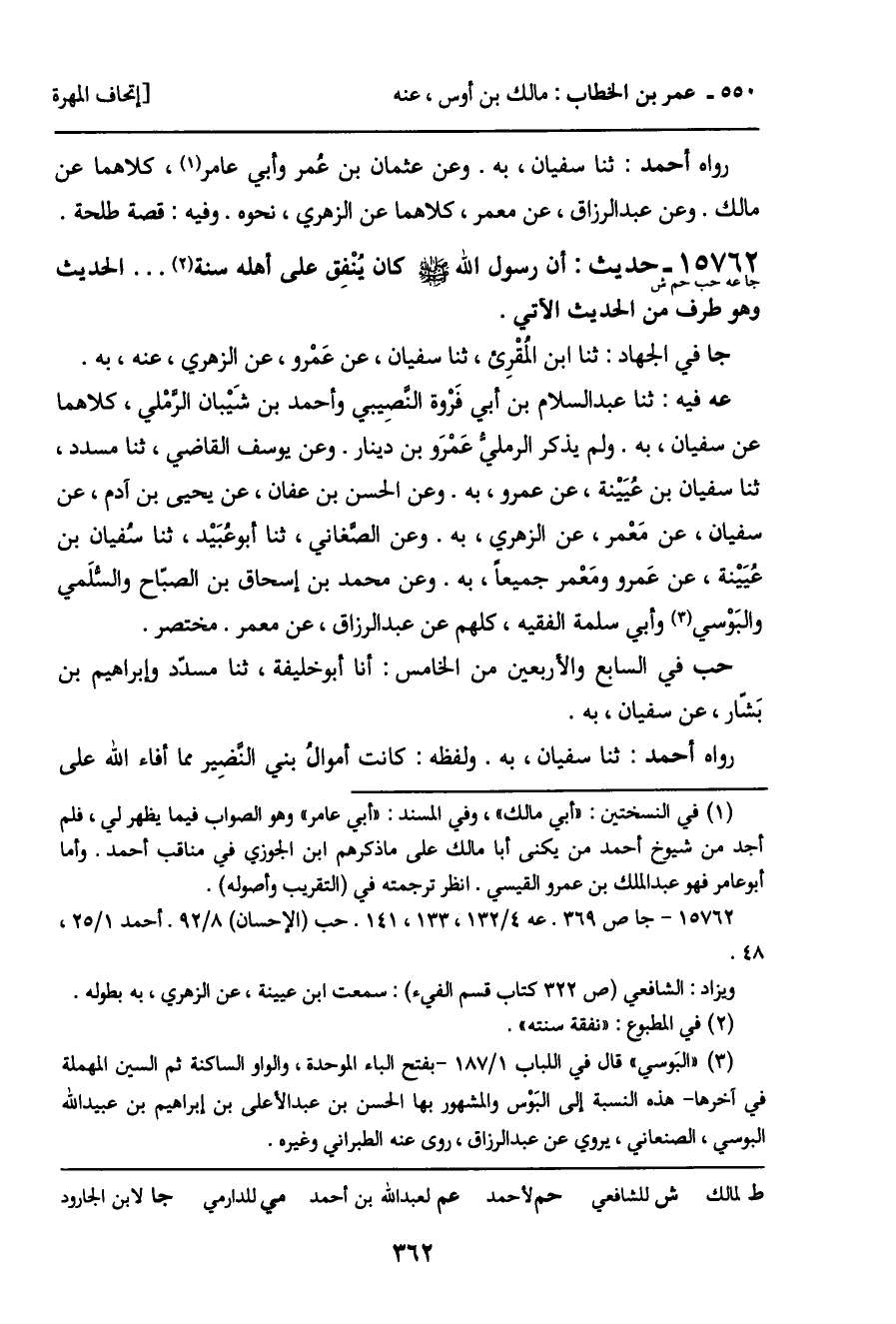 -[363]- رسوله، مما لم يُوجِف المسلمون عليه بخَيْل ولا ركاب، فكانت لرسول الله - صَلَّى اللَّهُ عَلَيْهِ وَسَلَّمَ - خالصة. وكان يُنْفق على أهله منها نَفقة سنة، وما بقي جَعَله في الكُراع والسِّلاح عدَّة في سبيل الله عز وجل. وأعاده: عن سفيان، عن عَمرو وحده، به.