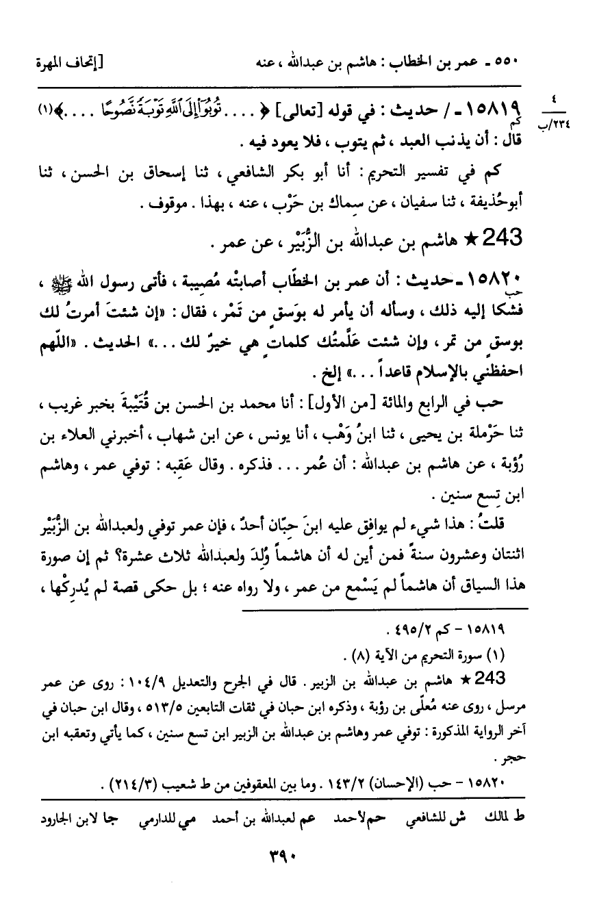 قلتُ: هذا شيء لم يوافِق عليه ابن حبان أحد، فإن عمر توفي ولعبد الله بن الزُّبيْر اثنتان وعشرون سنة فمن أين له أن هاشماً ولِدَ ولعبد الله ثلاث عشرة؟ ثم إن صورة هذا السياق أن هاشماً لم يَسْمع من عمر، ولا رواه عنه؛ بل حكى قصة لم يُدرِكْها،
