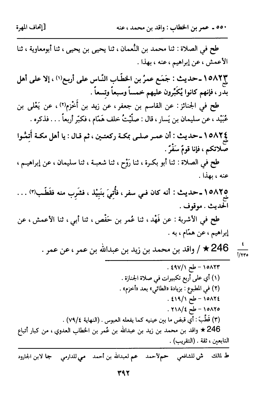 15823 - حديث (طح) : جَمَع عمر بن الخطاب الناس على أربع، إلا على أهل بدر، فإنهم كانوا يُكبِّرون عليهم خمساً وسبعاً وتِسعاً.