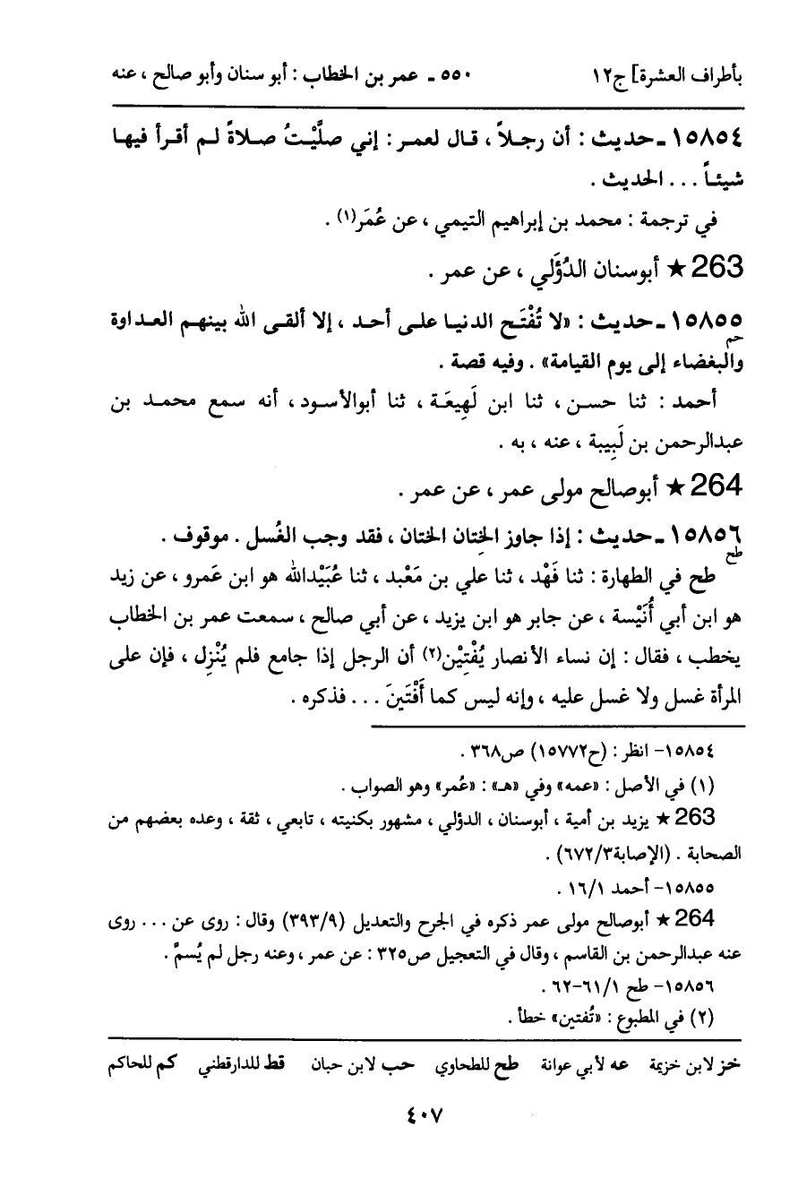 طح في الطهارة: ثنا فَهْد، ثنا علي بن مَعْبد، ثنا عُبيْد الله هو ابن عَمرو، عن زيد هو ابن أبي أُنَيْسة، عن جابر هو ابن يزيد، عن أبي صالح، سمعت عمر بن الخطاب يخطب، فقال: إن نساء الأنصار يُفْتِيْن أن الرجل إذا جامع فلم يُنْزِل، فإن على المرأة غسل ولا غسل عليه، وإنه ليس كما أَفْتَينَ ... فذكره.