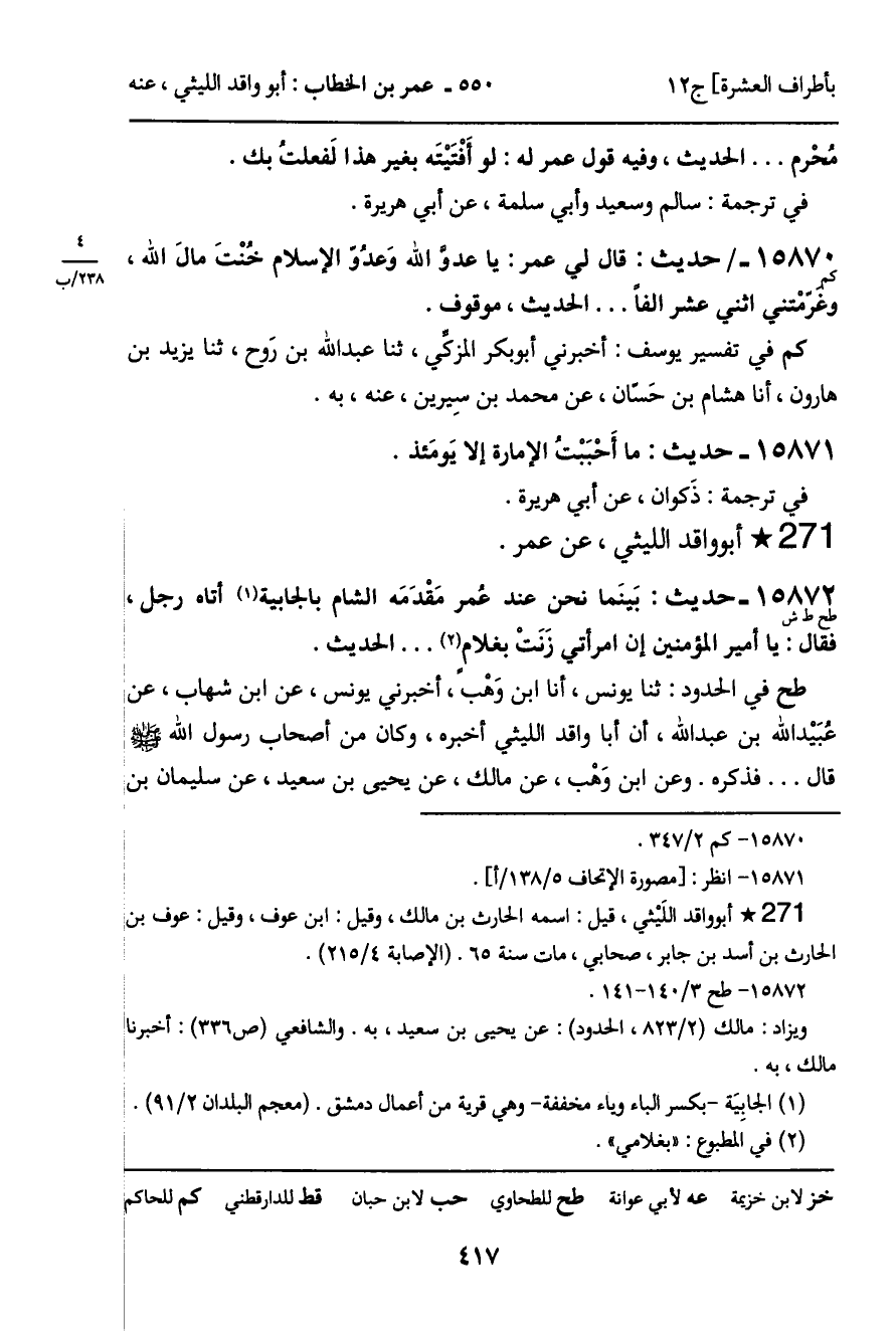 15870 - حديث (كم) : قال لي عمر: يا عدوَّ الله وَعدُوّ الإسلام خُنْتَ مالَ الله، وغرّمْتني اثني عشر الفاً ... الحديث، موقوف.