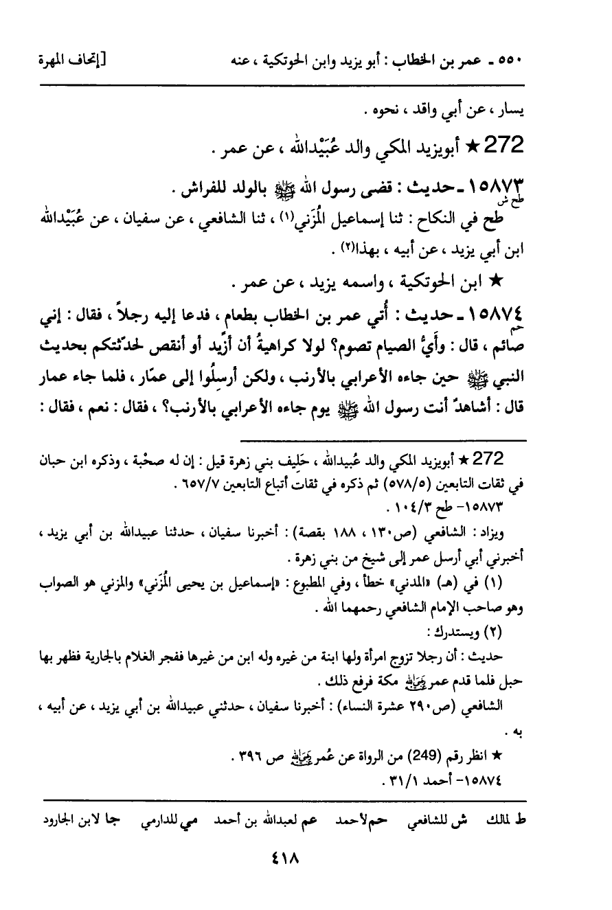 15874 - حديث (حم) : أُتي عمر بن الخطاب بطعام، فدعا إليه رجلاً، فقال: إني صائم، قال: وأَي الصيام تصوم؟ لولا كراهيةُ أن أزيد أو أنقص لحدّثتكم بحديث النبي - صَلَّى اللَّهُ عَلَيْهِ وَسَلَّمَ - حين جاءه الأعرابي بالأرنب، ولكن أرسِلُوا إلى عمّار، فلما جاء عمار قال: أشاهد أنت رسول الله - صَلَّى اللَّهُ عَلَيْهِ وَسَلَّمَ - يوم جاءه الأعرابي بالأرنب؟، فقال: نعم، فقال: