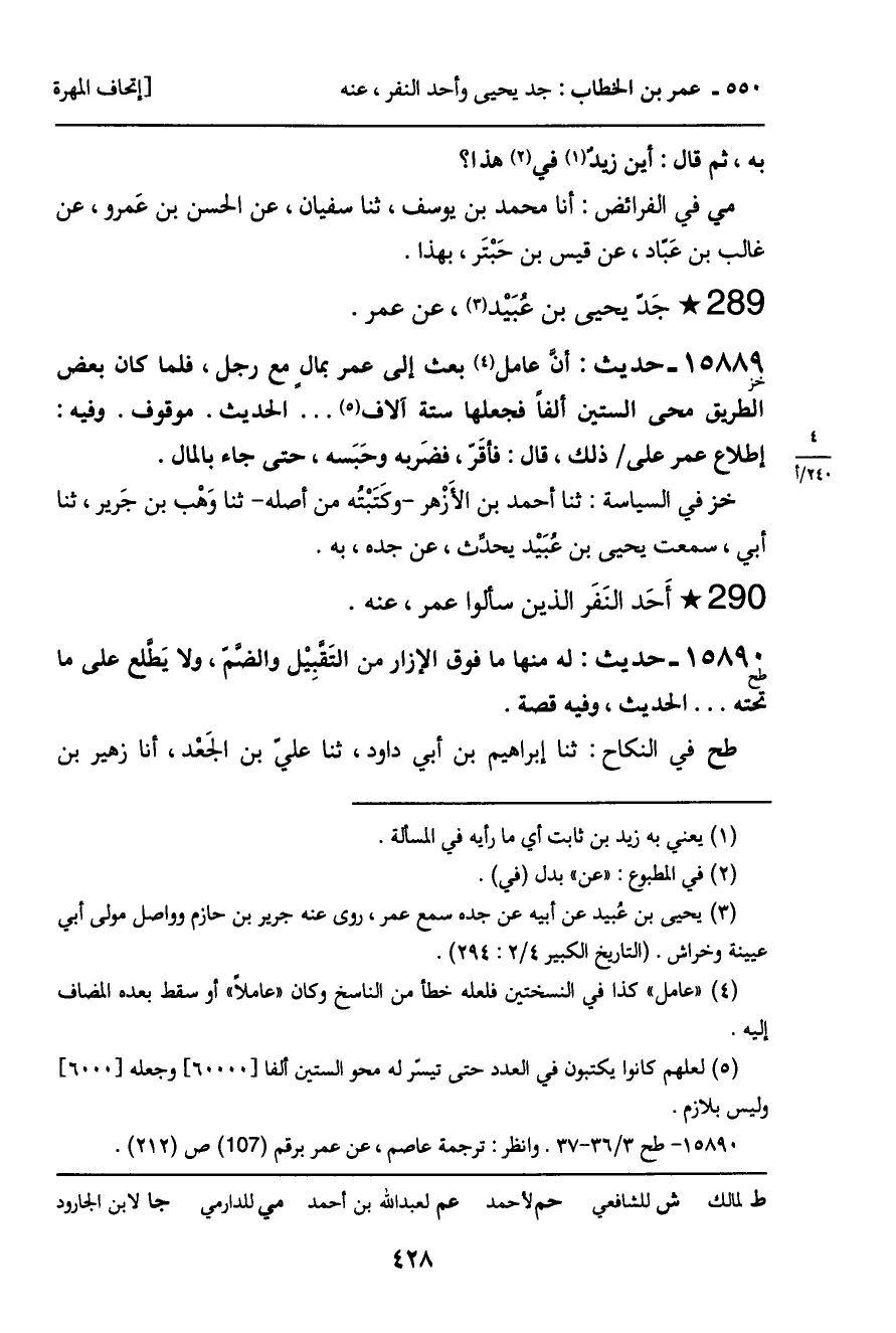 -[429]- معاوية، عن أبي إسحاق، عن عاصم بن عَمرو الشامي، عن أحد النفر الذين سألوا عمر ... فذكره. وعن فَهْد، ثنا أبو غسان، ثنا إسرائيل، عن أبي إسحاق، عن عاصم بن عَمرو البجلي: أن قوماً أَتَوا عُمر ... فذكره. وعن أبي بَكْرة، ثنا أبو داود، ثنا المَسْعودِي، ثنا عاصم بن عَمرو، فذكر مثل رواية إسرائيل. وعن فهد، عن علي ابن مَعْبد، عن عبيد الله بن عَمرو، عن زيد بن أبي أُنَيْسة، عن أبي إسحاق، عن عاصم بن عمرو، عن عُمَيْر مولى لعمر، عن عمر ... فذكره.