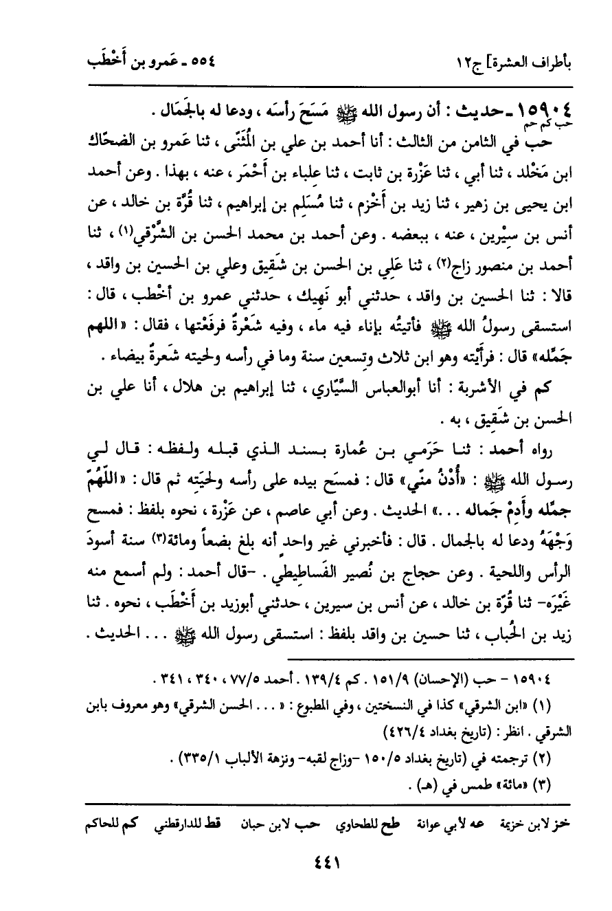 حب في الثامن من الثالث: أنا أحمد بن علي بن المثنّى، ثنا عَمرو بن الضحّاك ابن مَخْلد، ثنا أبي، ثنا عَزْرة بن ثابت، ثنا عِلباء بن أَحْمَر، عنه، بهذا. وعن أحمد ابن يحيى بن زهير، ثنا زيد بن أَخْزم، ثنا مُسَلِم بن إبراهيم، ثنا قُرَّة بن خالد، عن أنس بن سِيْرين، عنه، ببعضه. وعن أحمد بن محمد الحسن بن الشرْقي، ثنا أحمد بن منصور زاج، ثنا عَلِي بن الحسن بن شَقِيق وعلي بن الحسين بن واقد، قالا: ثنا الحسين بن واقد، حدثني أبو نَهِيك، حدثني عمرو بن أخْطب، قال: استسقى رسولُ الله - صَلَّى اللَّهُ عَلَيْهِ وَسَلَّمَ - فأتيتُه بإناء فيه ماء، وفيه شَعْرة فرفعْتها، فقال: "اللهم جَمِّله" قال: فرأْيته وهو ابن ثلاث وتِسعين سنة وما في رأسه ولحيته شعرة بيضاء.
