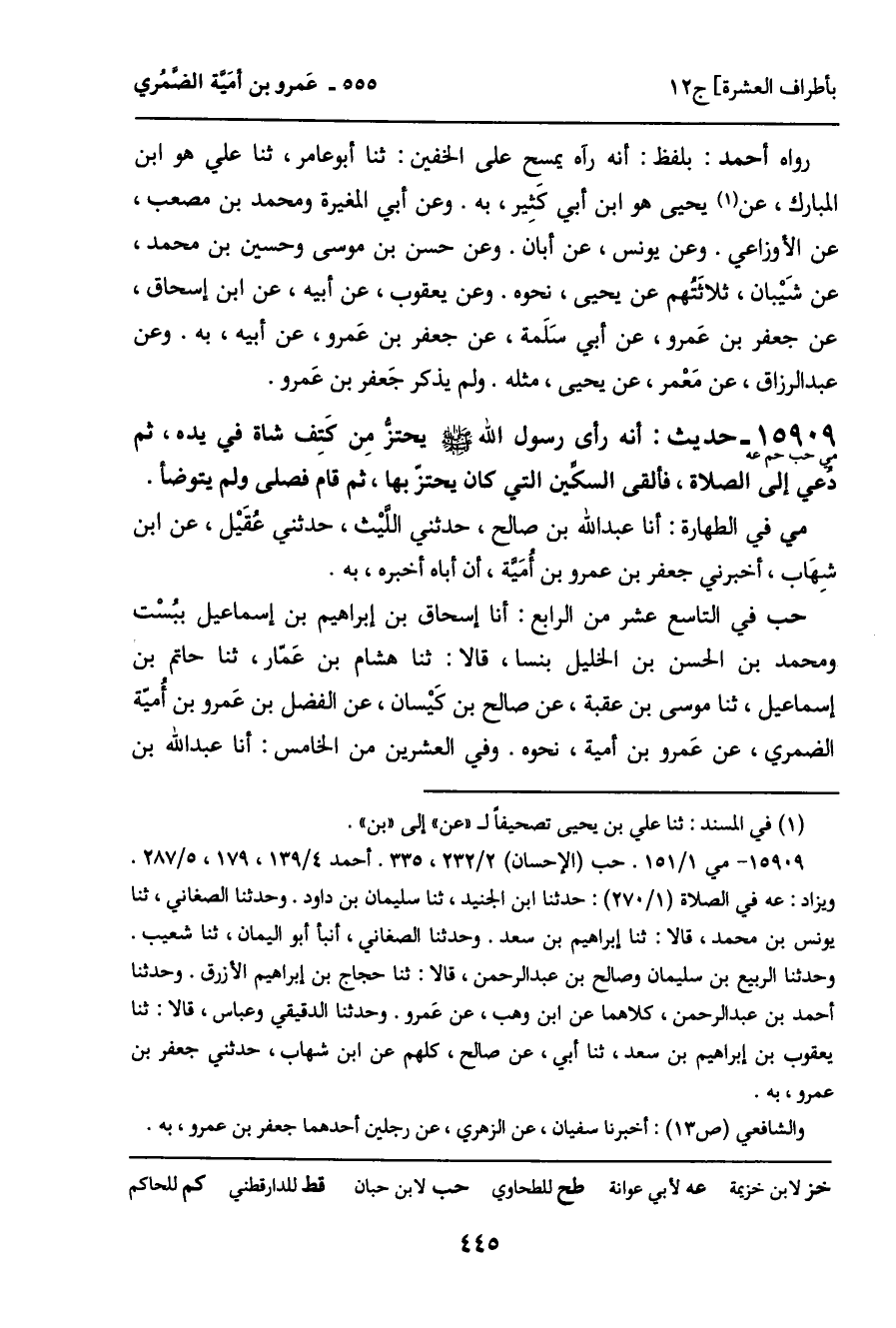 حب في التاسع عشر من الرابع: أنا إسحاق بن إبراهيم بن إسماعيل ببُسْت ومحمد بن الحسن بن الخليل بنسا، قالا: ثنا هشام بن عمّار، ثنا حاتم بن إسماعيل، ثنا موسى بن عقبة، عن صالح بن كَيْسان، عن الفضل بن عَمرو بن أُميّة الضمري، عن عَمرو بن أمية، نحوه. وفي العشرين من الخامس: أنا عبد الله بن