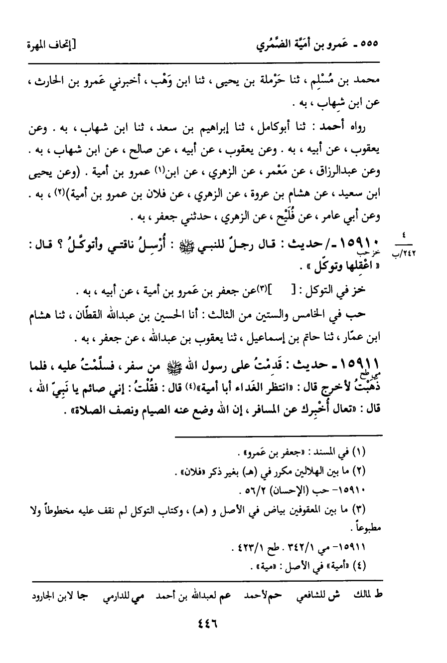 15910 - حديث (خز حب) : قال رجل للنبي - صَلَّى اللَّهُ عَلَيْهِ وَسَلَّمَ -: أُرْسِلُ ناقتي وأتوكلُ؟ قال: "اعْقلها وتوكّل".