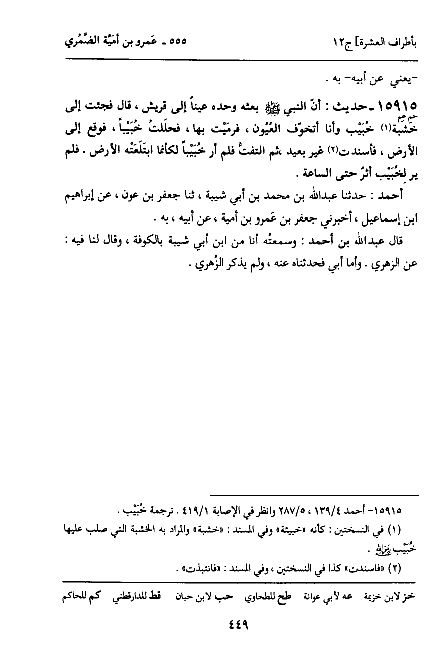 15915 - حديث (حم عه) : أن النبي - صَلَّى اللَّهُ عَلَيْهِ وَسَلَّمَ - بعثه وحده. عيناً إلى قريش، قال فجئت إلى خشبة خُبَيْب وأنا أتخوف العُيُون، فرميت بها، فحللتُ خُبَيْبا، فوقع إلى الأرض، فأسندت غير بعيد ثم التفتُّ فلم أر خُبَيْباً لكأنما ابتَلَعَتْه الأرض. فلم ير لِخبيب أثرٌ حتى الساعة.