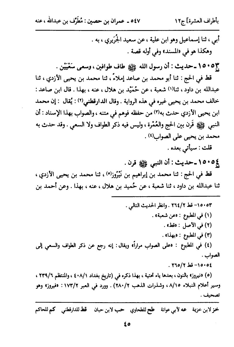 قط في الحج: ثنا أبو محمد بن صاعد إملاء، ثنا محمد بن يحيى الأزدي، ثنا عبد الله بن داود، ثنا شعبة، عن حُمَيْد بن هلال، عنه، بهذا. قال ابن صاعد: خالف محمد بن يحيى غيره في هذه الرواية. وقال الدارقطني: يقال: إن محمد ابن يحيى الأزدي حدث به من حفظه فوهم في متنه، والصواب بهذا الإسناد: أن النبي - صَلَّى اللَّهُ عَلَيْهِ وَسَلَّمَ - قَرن بين الحج والعُمْرة، وليس فيه ذكر الطواف ولا السعي. وقد حدث به محمد بن يحيى على الصواب.