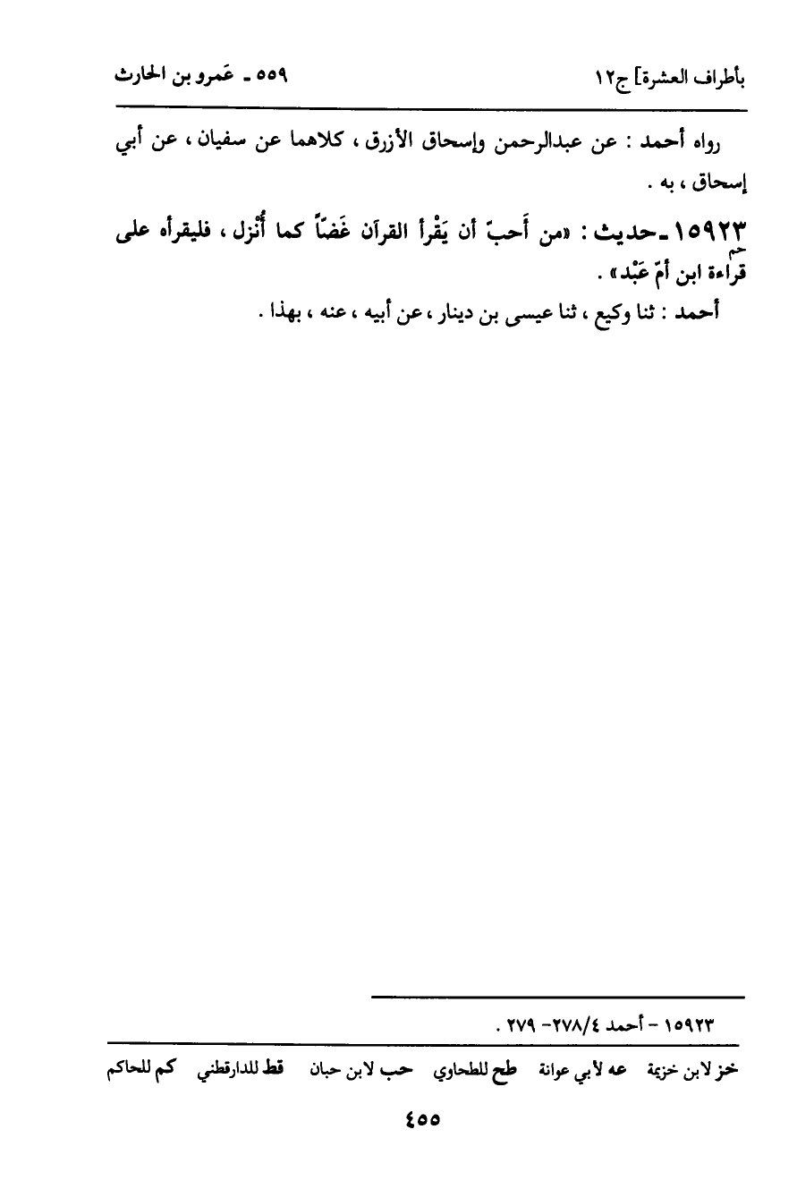 15923 - حديث (حم) : "من أحب أن يقرأ القرآن غضاً كما أُنْزل، فليقرأه على قراءة ابن أمّ عبْد".