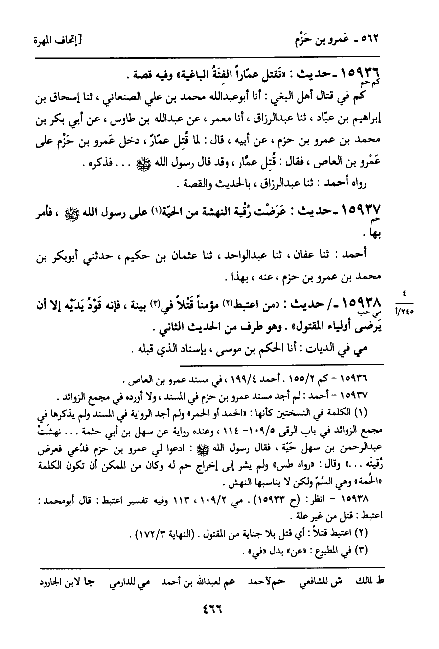 كم في قتال أهل البغي: أنا أبو عبد الله محمد بن علي الصنعاني، ثنا إسحاق بن إبراهيم بن عبّاد، ثنا عبد الرزاق، أنا معمر، عن عبد الله بن طاوس، عن أبي بكر بن محمد بن عمرو بن حزم، عن أبيه، قال: لما قُتِل عمّارٌ، دخل عَمرو بن حَزْم على عَمْرو بن العاص، فقال: قُتِل عمَّار، وقد قال رسول الله - صَلَّى اللَّهُ عَلَيْهِ وَسَلَّمَ - ... فذكره.