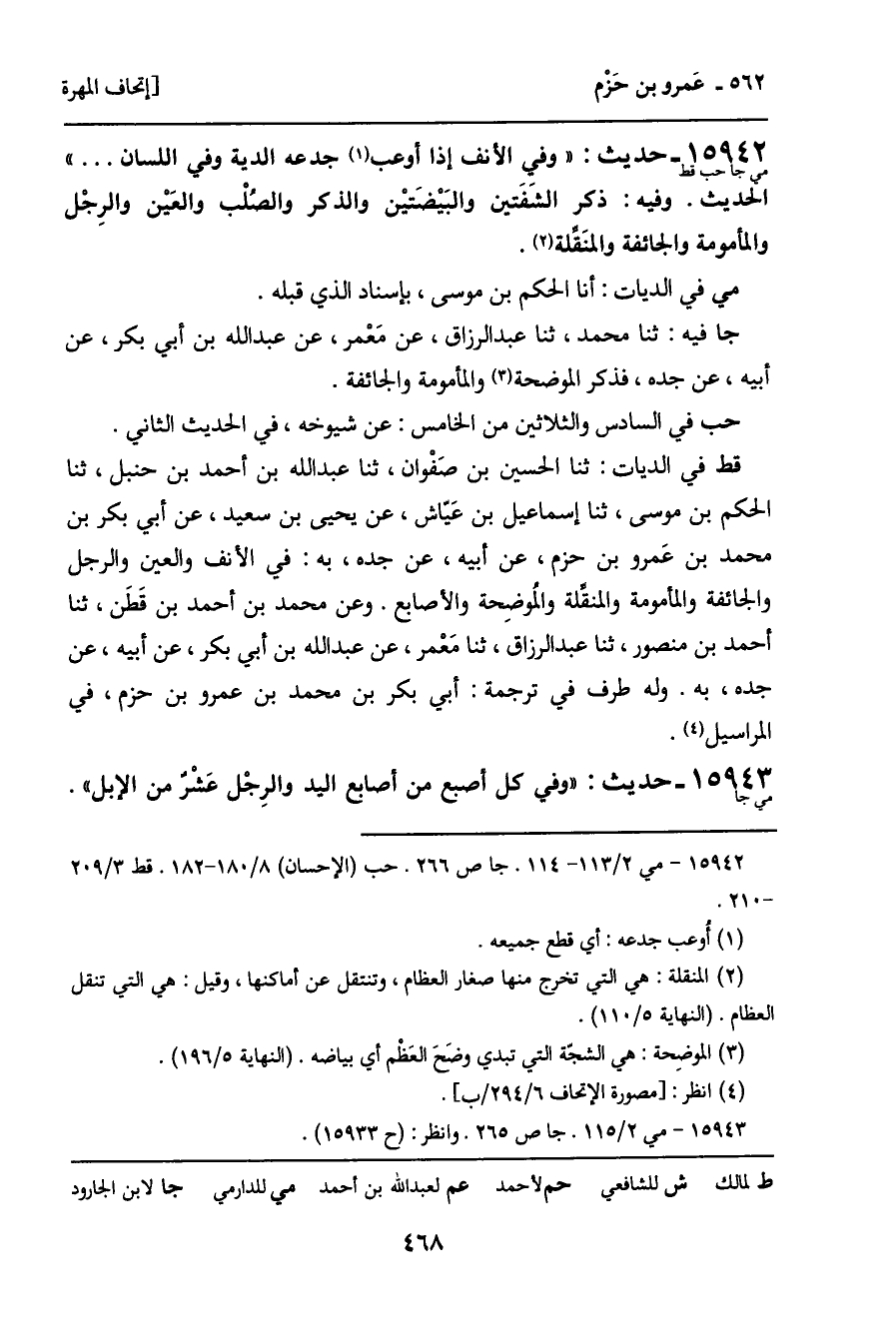 قط في الديات: ثنا الحسين بن صفوان، ثنا عبد الله بن أحمد بن حنبل، ثنا الحكم بن موسى، ثنا إسماعيل بن عَيّاش، عن يحيى بن سعيد، عن أبي بكر بن محمد بن عَمرو بن حزم، عن أبيه، عن جده، به: في الأنف والعين والرجل والجائفة والمأمومة والمنقِّلة والمُوضِحة والأصابع. وعن محمد بن أحمد بن قَطَن، ثنا أحمد بن منصور، ثنا عبد الرزاق، ثنا مَعْمر، عن عبد الله بن أبي بكر، عن أبيه، عن جده، به. وله طرف في ترجمة: أبي بكر بن محمد بن عمرو بن حزم، في المراسيل.