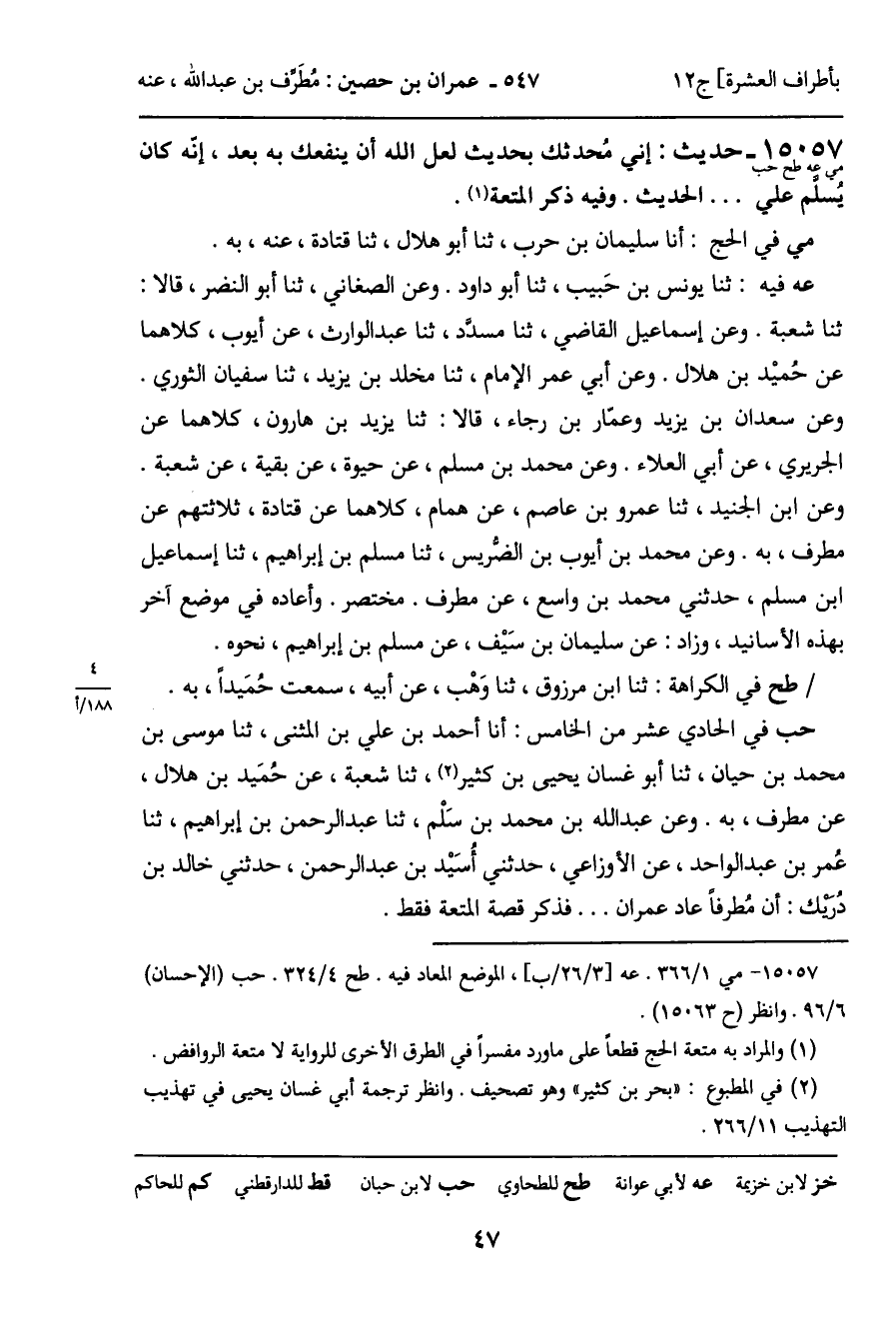 حب في الحادي عشر من الخامس: أنا أحمد بن علي بن المثنى، ثنا موسى بن محمد بن حيان، ثنا أبو غسان يحيى بن كثير، ثنا شعبة، عن حُمَيد بن هلال، عن مطرف، به. وعن عبد الله بن محمد بن سَلْم، ثنا عبد الرحمن بن إبراهيم، ثنا عُمر بن عبد الواحد، عن الأوزاعي، حدثني أُسَيْد بن عبد الرحمن، حدثني خالد بن دُريك: أن مُطرفاً عاد عمران ... فذكر قصة المتعة فقط.