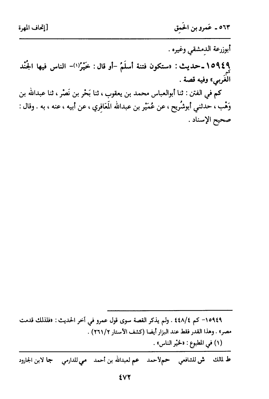 15949 - حديث (كم) : "ستكون فتنة أسلَمُ - أو قال: خَيْرُ - الناس فيها الجُنْد الغربي" وفيه قصة.