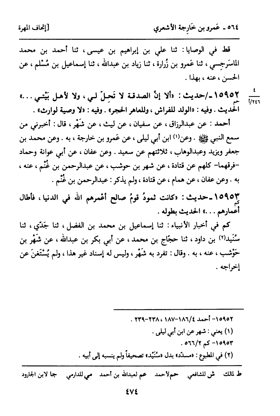 أحمد: عن عبد الرزاق، عن سفيان، عن ليث، عن شَهْر، قال: أخبرني من سمع النبي - صَلَّى اللَّهُ عَلَيْهِ وَسَلَّمَ -. وعن ابن أبي ليلى، عن عَمرو بن خارجة، به. وعن محمد بن جعفر ويزيد وعبد الوهاب، ثلاثتهم عن سعيد. وعن عفان، عن أبي عوانة وحماد - فرقهما - كلهم عن قتادة، عن شهر بن حوشب، عن عبد الرحمن بن غنم، عنه، به. وعن عفان، عن همام، عن قتادة، ولم يذكر: عبد الرحمن بن غُنْم.
