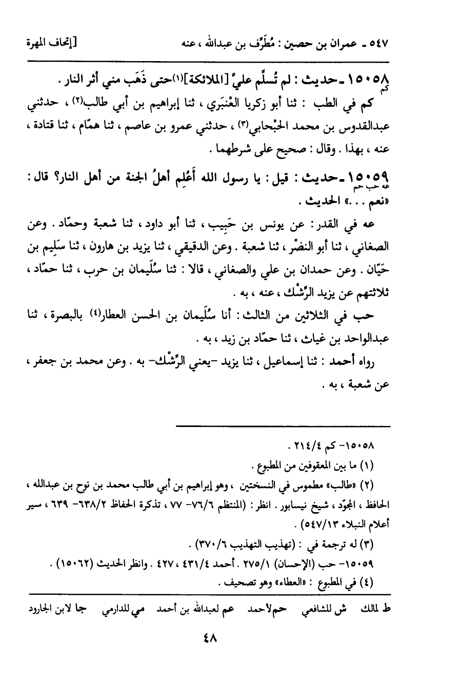 كم في الطب: ثنا أبو زكريا العْنبَري، ثنا إبراهيم بن أبي طالب، حدثني عبد القدوس بن محمد الحبْحابي، حدثني عمرو بن عاصم، ثنا همّام، ثنا قتادة، عنه، بهذا. وقال: صحيح على شرطهما.