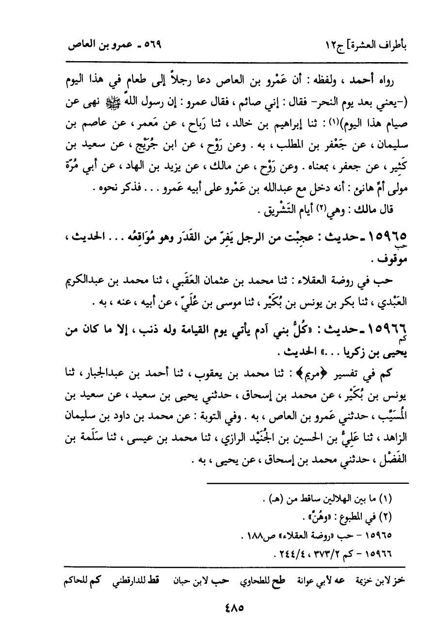 كم في تفسير (مريم) : ثنا محمد بن يعقوب، ثنا أحمد بن عبد الجبار، ثنا يونس بن بُكيْر، عن محمد بن إسحاق، حدثني يحيى بن سعيد، عن سعيد بن المسيب، حدثني عَمرو بن العاص، به. وفي التوبة: عن محمد بن داود بن سليمان الزاهد، ثنا عَلِي بن الحسين بن الجُنَيد الرازي، ثنا محمد بن عيسى، ثنا سَلَمة بن الفَضْل، حدثني محمد بن إسحاق، عن يحيى، به.
