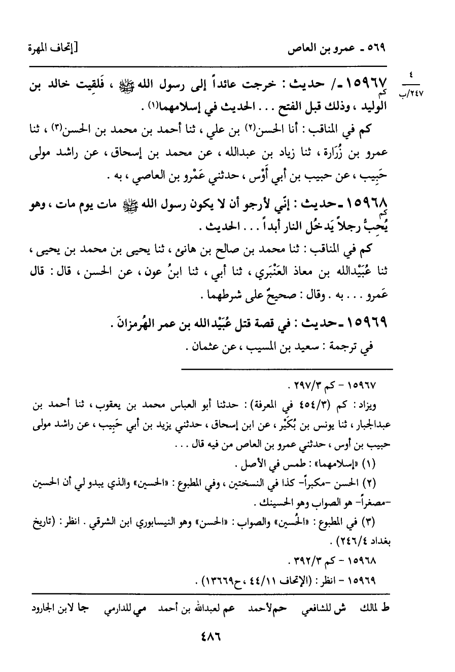 15967 - حديث (كم) : خرجت عائداً إلى رسول الله - صَلَّى اللَّهُ عَلَيْهِ وَسَلَّمَ -، فَلقيت خالد بن الوليد، وذلك قبل الفتح ... الحديث في إسلامهما.