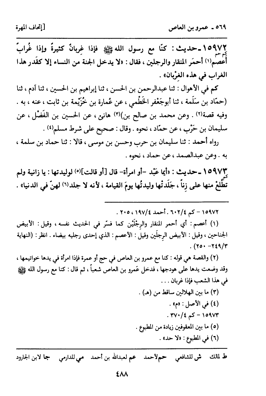 15972 - حديث (كم حم) : كنّا مع رسول الله - صَلَّى اللَّهُ عَلَيْهِ وَسَلَّمَ - فإذا غِربانْ كثيرة وإذا غُراب أعصم أحمَر المنقار والرجلين، فقال: "لا يدخل الجنة من النساء إلا كقَدر هذا الغراب في هذه الغِرْبان".