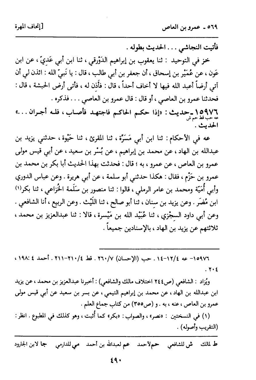 عه في الأحكام: ثنا ابن أبي مَسَرَّة، ثنا المقرئ، ثنا حيْوة، حدثني يزيد بن عبد الله بن الهاد، عن محمد بن إبراهيم، عن بُسْر بن سعيد، عن أبي قيس مولى عمرو بن العاص، عن عمرو، به؛ قال: فحدثت بهذا الحديث أبا بكر بن محمد بن عمرو بن حَزْم، فقال: هكذا حدثني أبو سلمة، عن أبي هريرة. وعن عباس الدوري وأبي أمَية ومحمد بن عامر الرملي، قالوا: ثنا منصور بن سَلَمة الخُزاعي، ثنا بكر ابن مُضَر. وعن يزيد بن سِنان، ثنا أبو صالح، ثنا اللَيْث. وعن الربيع، أنا الشافعي.