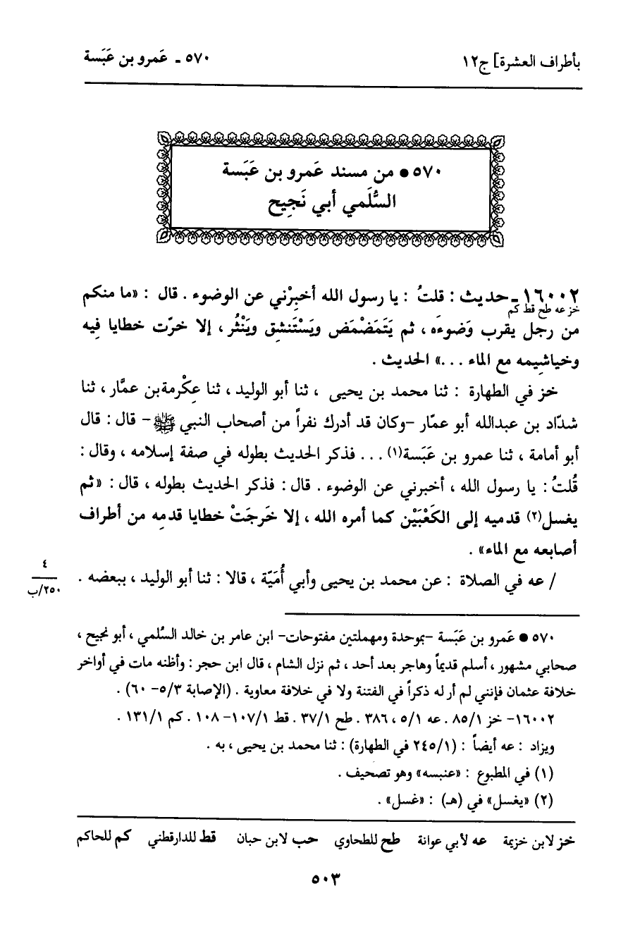 خز في الطهارة: ثنا محمد بن يحيى، ثنا أبو الوليد، ثنا عِكْرمة بن عمار، ثنا شدّاد بن عبد الله أبو عمّار - وكان قد أدرك نفراً من أصحاب النبي (صَلَّى اللَّهُ عَلَيْهِ وَسَلَّمَ) - قال: قال أبو أمامة، ثنا عمرو بن عَبَسة ... فذكر الحديث بطوله في صفة إسلامه، وقال: قلتُ: يا رسول الله، أخبرني عن الوضوء. قال: فذكر الحديث بطوله، قال: "ثم يغسل، قدميه إلى الكعبَيْن كما أمره الله، إلا خَرجَتْ خطايا قدمِه من أطراف أصابعه مع الماء".