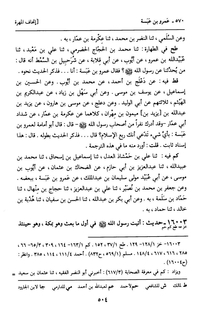 -[506]- مختصرا. وعن أبي العباس، ثنا بَحر بن نَصْر، به. وعن أبي بكر بن إسحاق، ثنا محمد بن أيُّوب، ثنا أبو الوليد، ثنا عِكْرمة بن عمّار، ثنا شدّاد أبو عمّار، قال: قال أبو أمامة: يا عَمْرو بن عَبَسَة بأي شيء تدعي أنك ربع الإسلام؟ قال: فذكر الحديث بطوله. وفي مناقب بلال: عن إبراهيم بن فِراس، عن بَكْر بن سَهل، عن عبد الله ابن صالح، عن معاوية بن صالح، عن سلَيْم بن عامر وهو أبو يحيى، ببعضه.