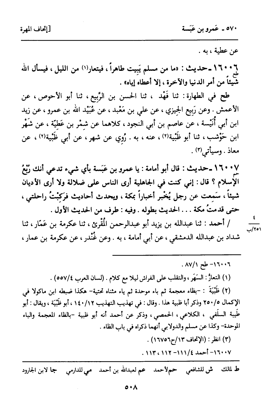 طح في الطهارة: ثنا فَهْد، ثنا الحسن بن الربيع، ثنا أبو الأحوص، عن الأعمش. وعن رَبِيع الجِيزي، عن علي بن مَعْبد، عن عبَيْد الله بن عمرو، عن زيد ابن أبي أُنَيْسة، عن عاصم بن أبي النجود، كلاهما عن شِمْر بن عَطِيّة، عن شَهْر ابن حَوْشب، ثنا أبو ظَبْية، عنه، به. رُوِي عن شهر، عن أبي ظَبْية، عن معاذ. وسيأتي.