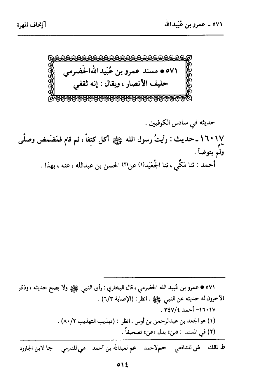 571 ـ مسند عمرو بن عبيد الله الحضرمي حليف الأنصار، ويقال: إنه ثقفي
