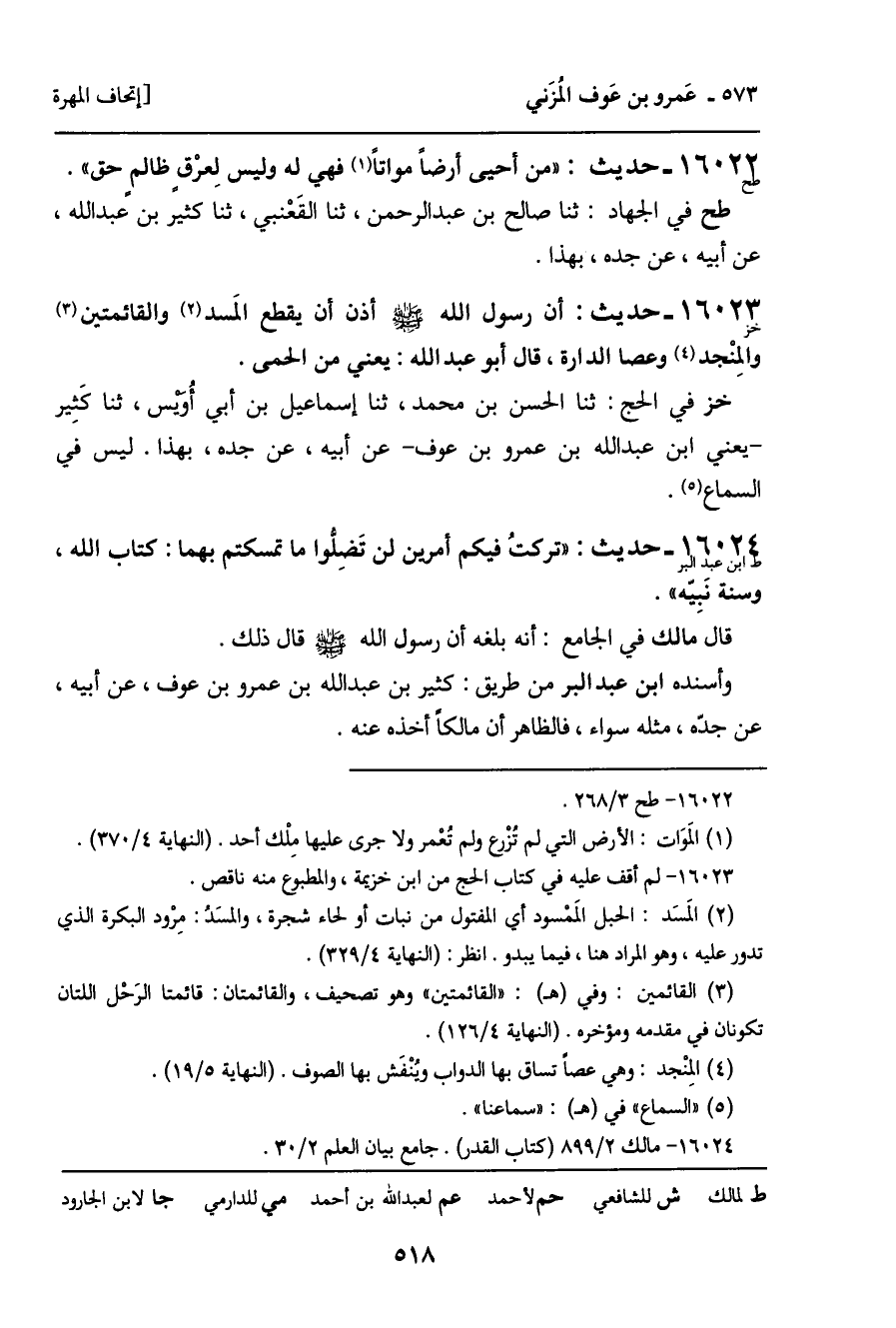 16023 - حديث (خز) : أن رسول الله - صَلَّى اللَّهُ عَلَيْهِ وَسَلَّمَ - أذن أن يقطع المَسد والقائمتين والمِنْجد وعصا الدارة، قال أبو عبد الله: يعني من الحمى.