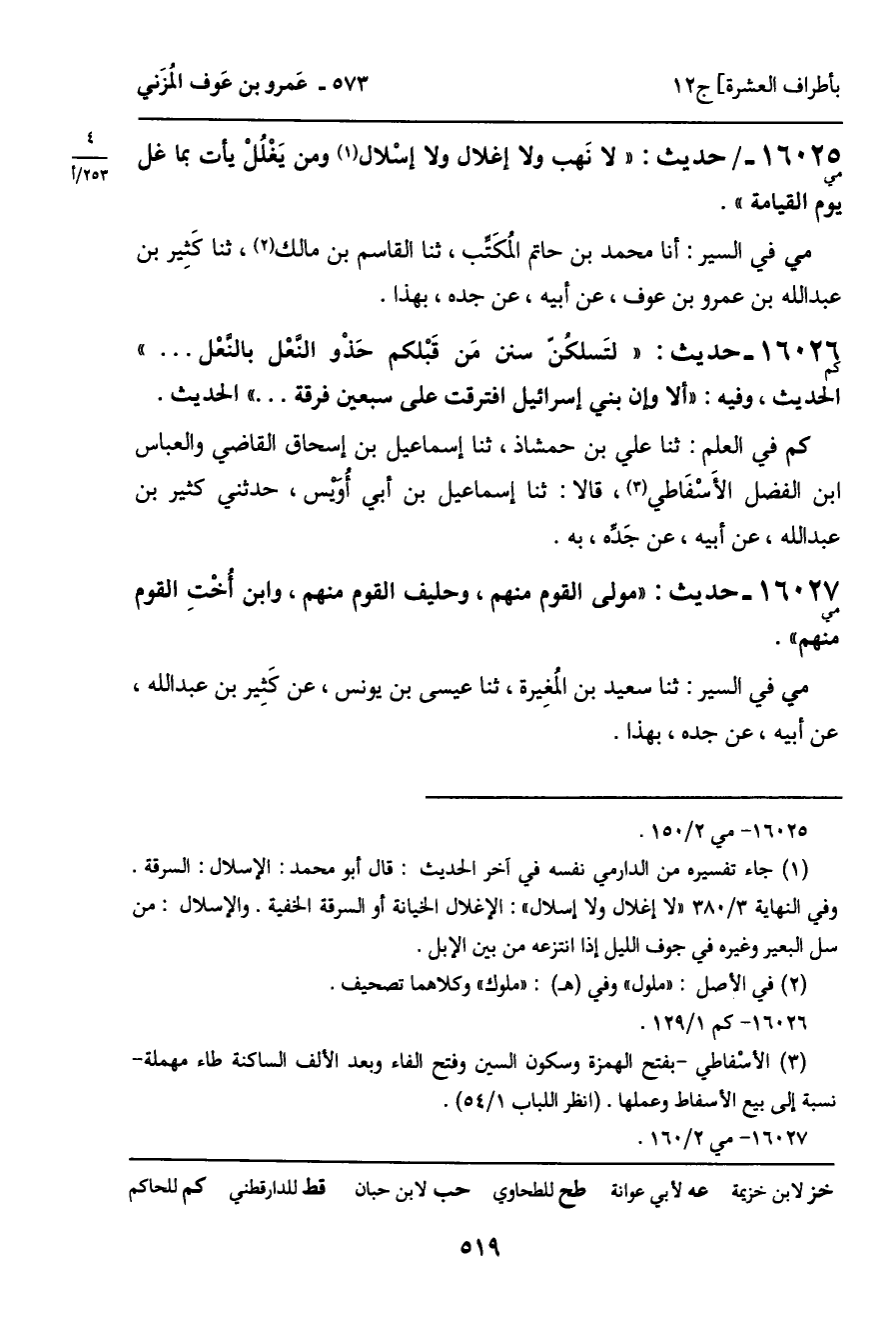 16025 - حديث (مي) : "لا نَهب ولا إغلال ولا إسْلال ومن يَغْلُلْ يأت بما غل يوم القيامة".