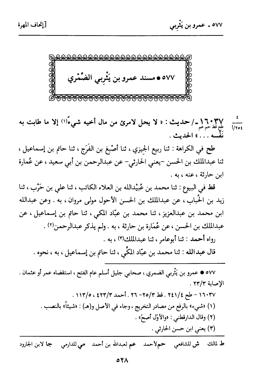 16037 - حديث (طح قط حم عم) : "لا يحل لامرئ من مال أخيه شيء إلا ما طابت به نَفْسه ... " الحديث.