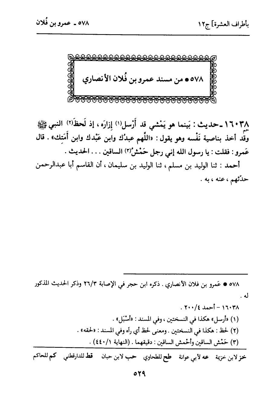 16038 - حديث (حم) : بَينما هو يَمْشي قد أرْسل إزارَه، إذ لَحظَ النبي - صَلَّى اللَّهُ عَلَيْهِ وَسَلَّمَ - وقد أخذ بناصية نَفْسه وهو يقول: "اللهم عبدُك وابن عَبْدك وابن أَمَتِك". قال عَمرو: فقلت: يا رسول الله إني رجل حَمْش الساقين ... الحديث.