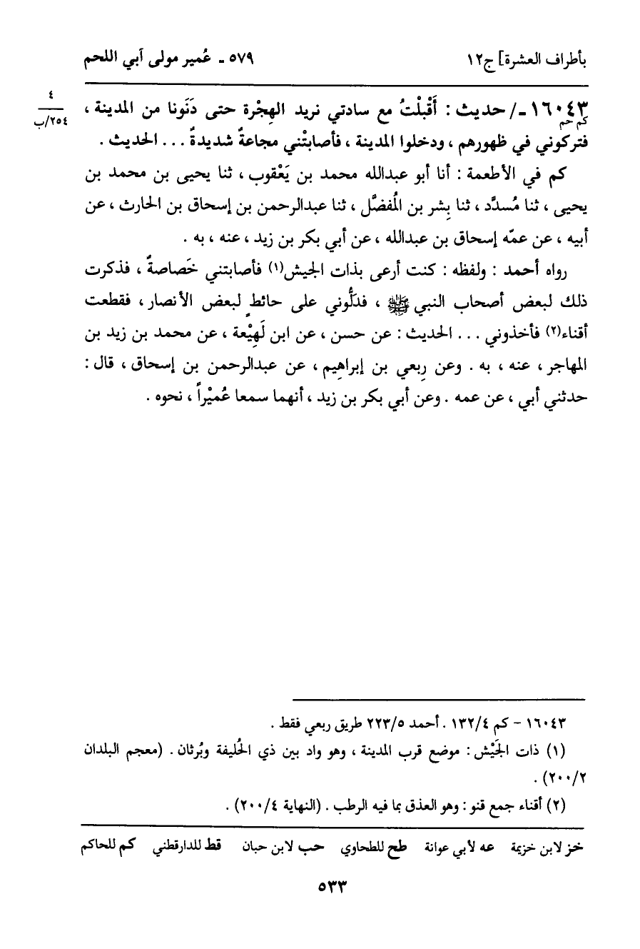 رواه أحمد: ولفظه: كنت أرعى بذات الجيش فأصابتني خَصاصة، فذكرت ذلك لبعض أصحاب النبي - صَلَّى اللَّهُ عَلَيْهِ وَسَلَّمَ -، فدلوني على حائط لبعض الأنصار، فقطعت أقناء فأخذوني ... الحديث: عن حسن، عن ابن لَهِيْعة، عن محمد بن زيد بن المهاجر، عنه، به. وعن رِبعي بن إبراهيم، عن عبد الرحمن بن إسحاق، قال: حدثني أبي، عن عمه. وعن أبي بكر بن زيد، أنهما سمعا عُميْراً، نحوه.