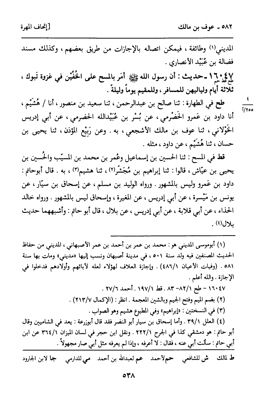 16047 - حديث (طح قط حم) : أن رسول الله - صَلَّى اللَّهُ عَلَيْهِ وَسَلَّمَ - أمَر بالمسح على الخُفين في غزوة تَبوك، ثلاثة أيام ولياليهن للمسافر، وللمقيم يوما وليلة.