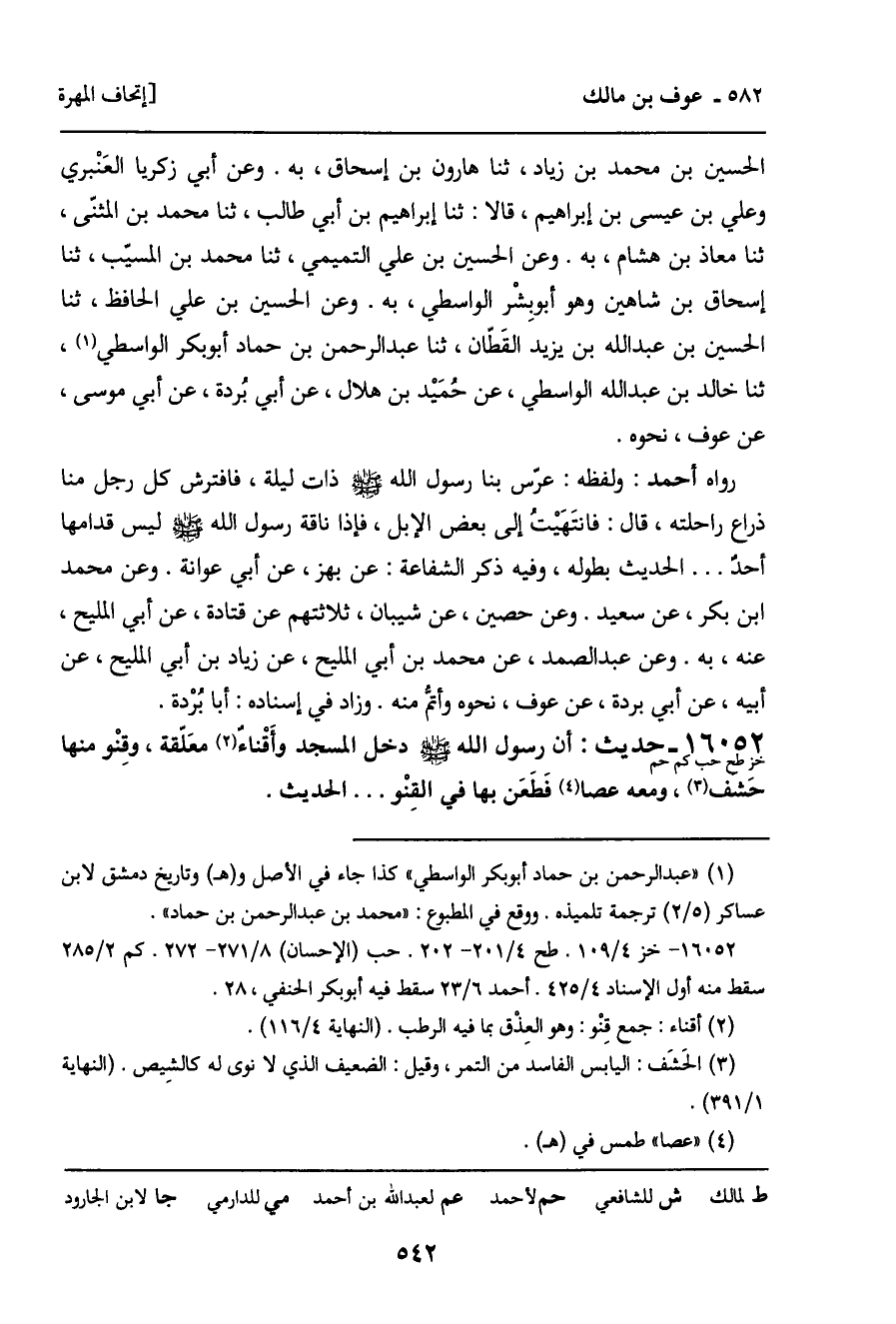 16052 - حديث (خز طح حب كم حم) : أن رسول الله - صَلَّى اللَّهُ عَلَيْهِ وَسَلَّمَ - دخل المسجد وأقْناة معَلّقة، وقنْو منها حَشف، ومعه عصا فَطَعن بها في القِنْو ... الحديث.