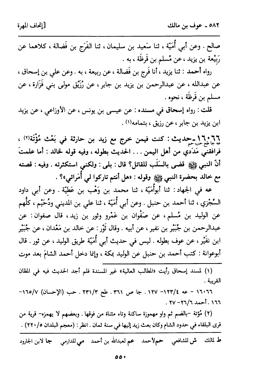 16066 - حديث (عه جا طح حب حم) : كنت فيمن خرج مع زيد بن حارثة في بَعْث مُؤْتَة، فرافقني مَدَدي من أهل اليمن ... الحديث بطوله، وفيه قوله لخالد: أما علمتَ أن النبي - صَلَّى اللَّهُ عَلَيْهِ وَسَلَّمَ - قضى بالسَلَب للقاتل؟ قال: بلى: ولكني استكثرته. وفيه: قصته مع خالد بحضرة النبي - صَلَّى اللَّهُ عَلَيْهِ وَسَلَّمَ - وقوله: "هل أنتم تاركوا لي أُمَرائي"؟.