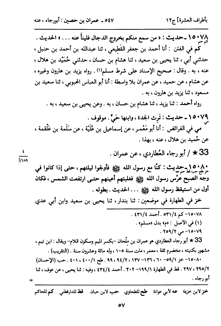 كم في الفتن: أنا أحمد بن جعفر القَطِيعي، ثنا عبد الله بن أحمد بن حنبل، حدثني أبي، ثنا يحيى بن سعيد، ثنا هشام بن حسان، حدثني حُمَيْد بن هلال، عنه، به. وقال: صحيح الإسناد على شرط مسلم. رواه يزيد بن هارون وغيره، عن هشام، عن حميد، عن عمران بلا واسطة: أنا أبو العباس المحبوبي، ثنا سعيد بن مسعود، ثنا يزيد بن هارون، به.