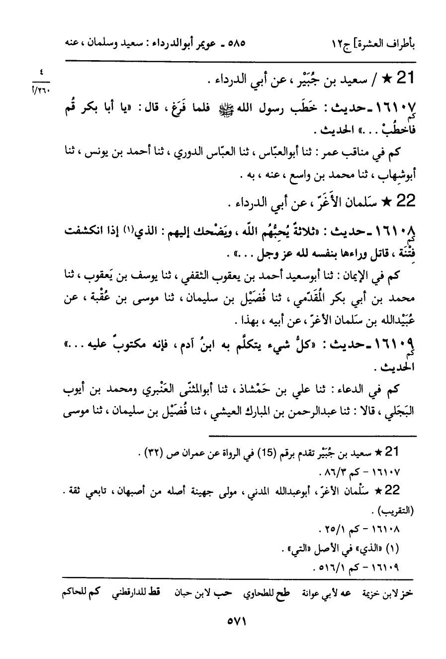 16108 - حديث (كم) : "ثلاثة يُحبهُم الله، وَيضْحك إليهم: الذي إذا إنكشفت فتنة، قاتل وراءها بنفسه لله عز وجل ... ".