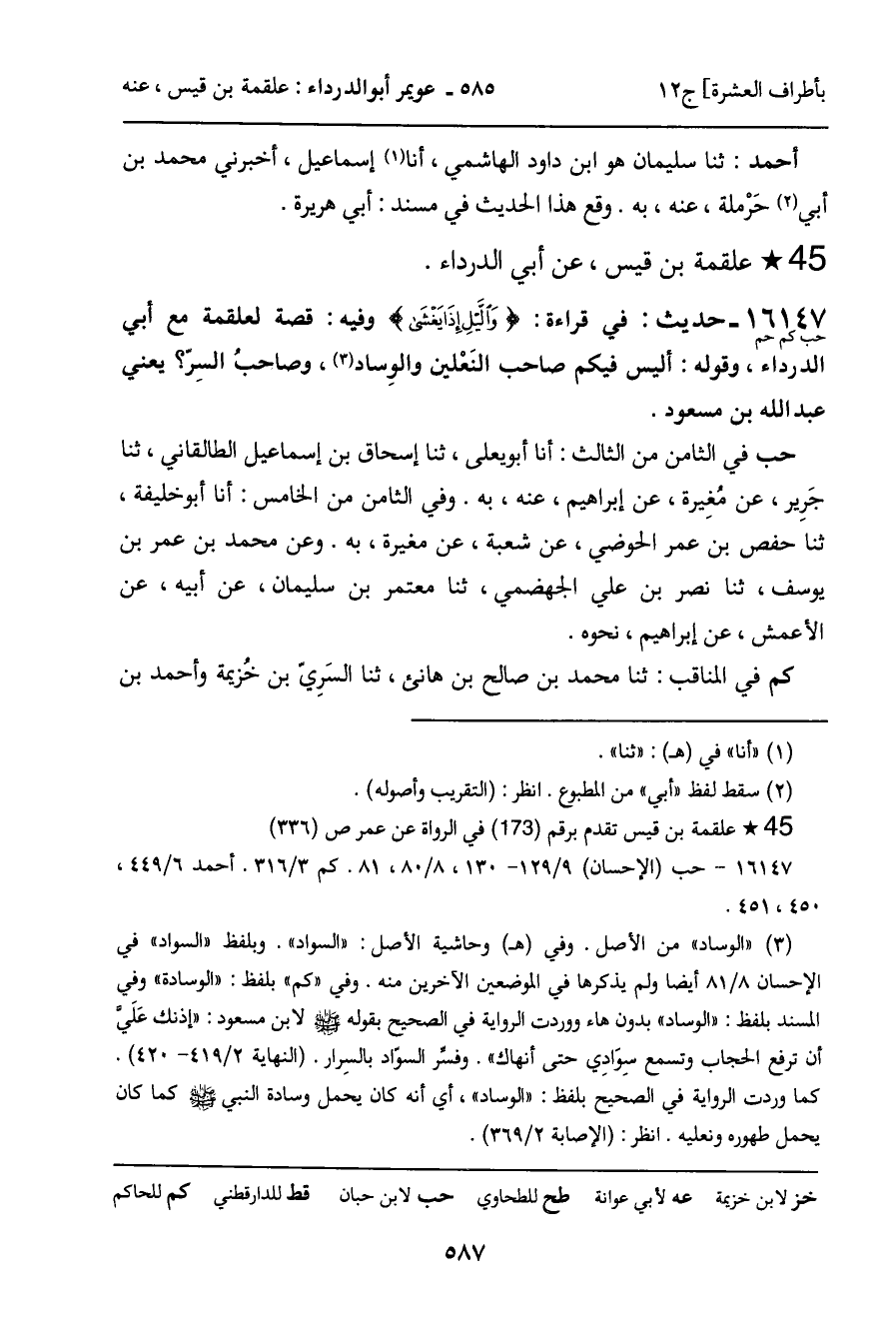 16147 - حديث (حب كم حم) : في قراءة: (وَاللَّيْلِ إِذَا يَغْشَى) وفيه: قصة لعلقمة مع أبي الدرداء، وقوله: أليس فيكم صاحب النَعْلين والوِساد، وصاحبُ السِرّ؟ يعني عبد الله بن مسعود.