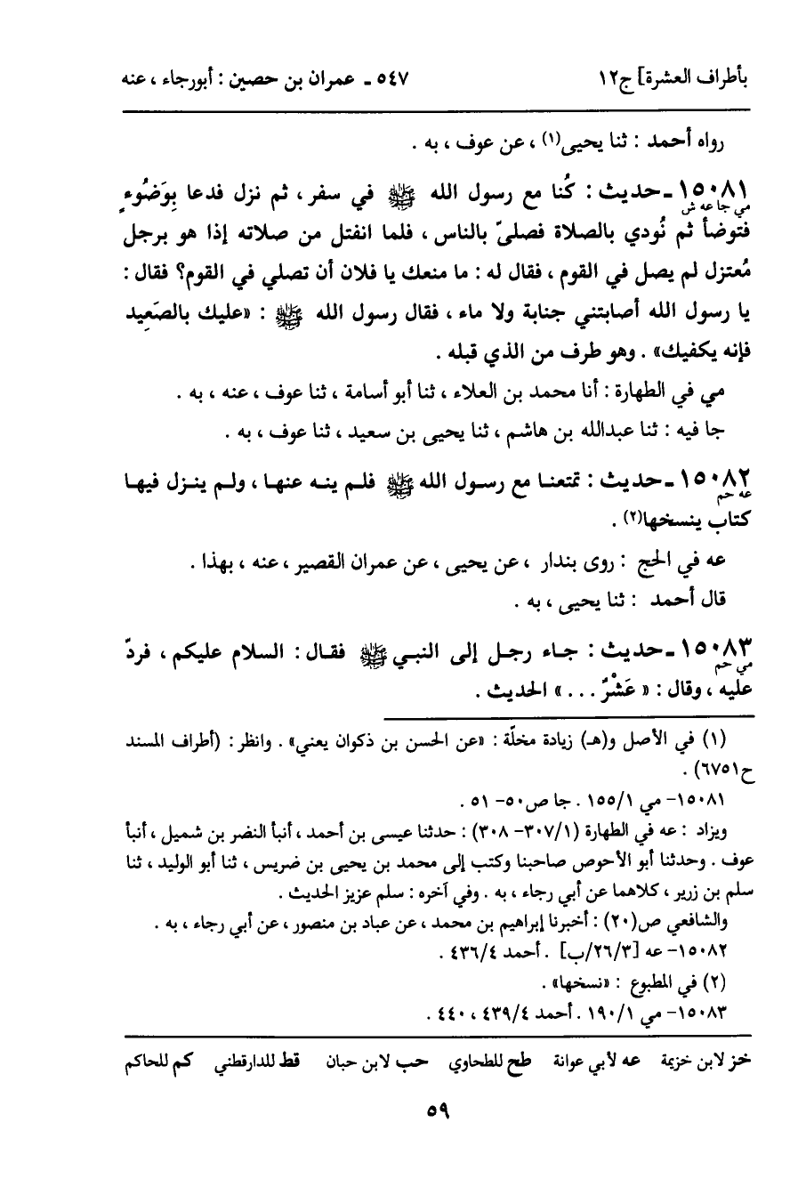15081 - حديث (مي جا عه ش) : كُنا مع رسول الله - صَلَّى اللَّهُ عَلَيْهِ وَسَلَّمَ - في سفر، ثم نزل فدعا بوضُوء فتوضأ ثم نودي بالصلاة فصلى بالناس، فلما انفتل من صلاته إذا هو برجل مُعتزل لم يصل في القوم، فقال له: ما منعك يا فلان أن تصلي في القوم؟ فقال: يا رسول الله أصابتني جنابة ولا ماء، فقال رسول الله - صَلَّى اللَّهُ عَلَيْهِ وَسَلَّمَ -: "عليك بالصَعِيد فإنه يكفيك". وهو طرف من الذي قبله.