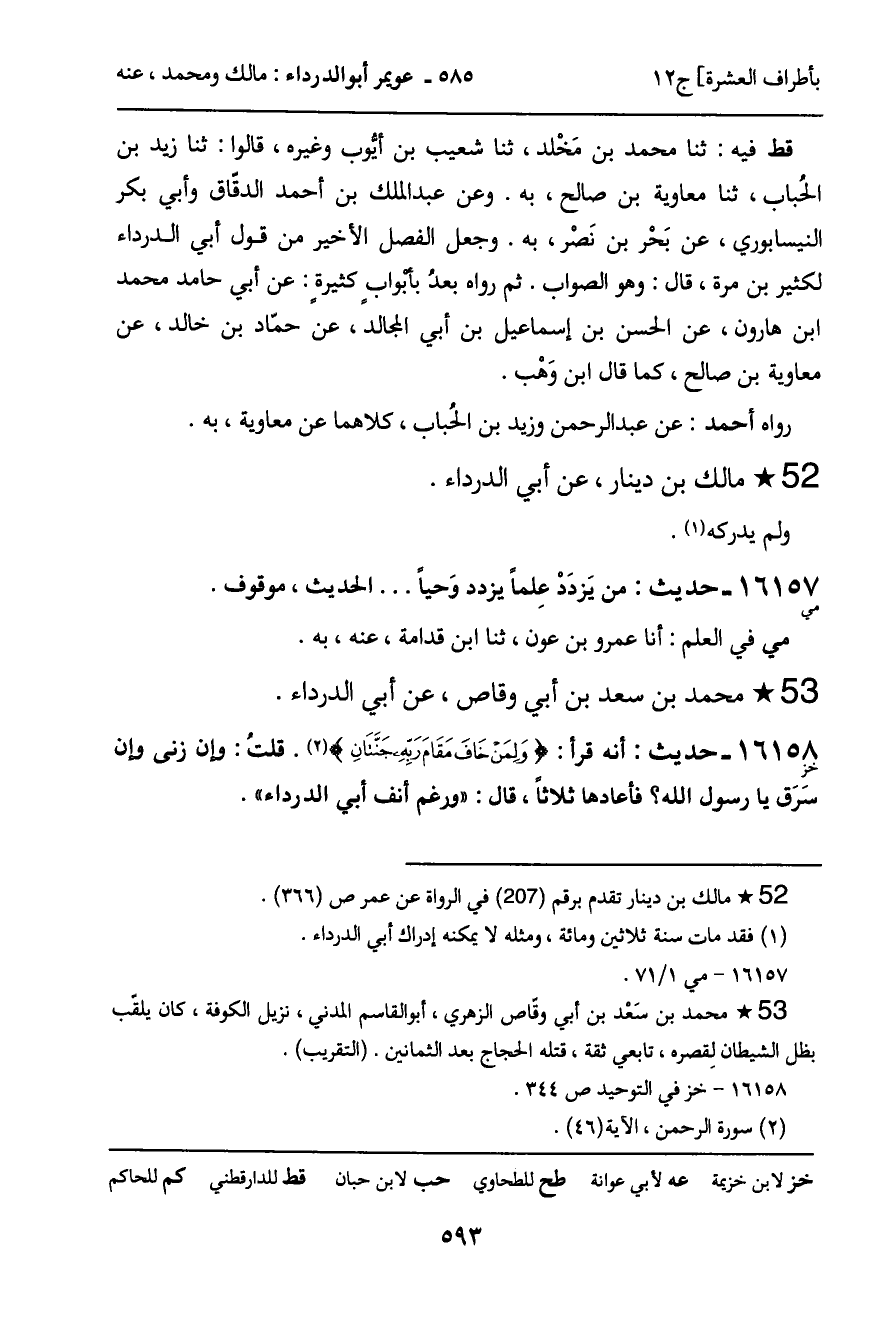 16158 - حديث (خز) : أنه قرأ: (وَلِمَنْ خَافَ مَقَامَ رَبِّهِ جَنَّتَانِ) . قلتُ: وإن زنى وإن سَرَق يا رسول الله؟ فأعادها ثلاثاً؟ قال: "ورغم أنف أبي الدرداء".