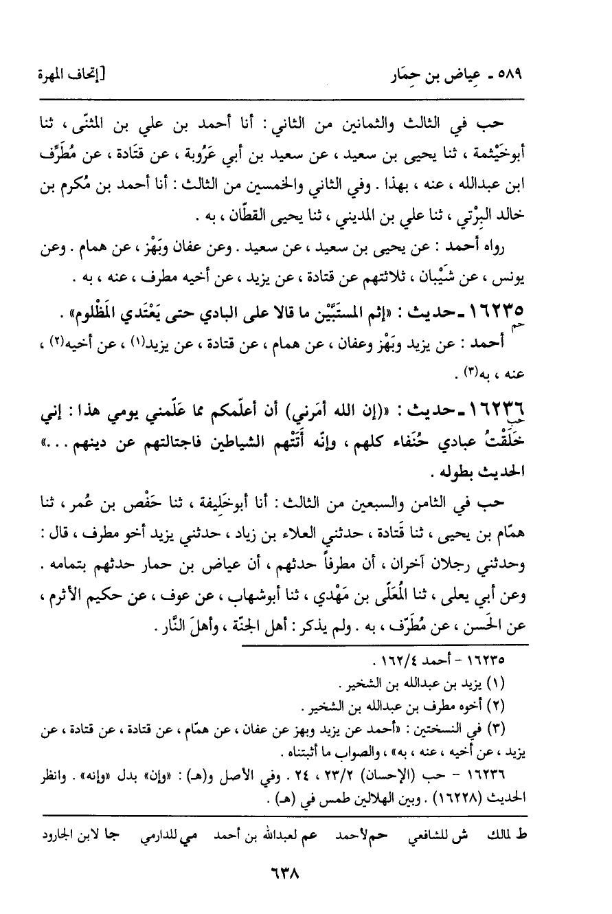 حب في الثامن والسبعين من الثالث: أنا أبو خَليفة، ثنا حَفْص بن عُمر، ثنا همّام بن يحيى، ثنا قَتادة، حدثني العلاء بن زياد، حدثني يزيد أخو مطرف، قال: وحدثني رجلان آخران، أن مطرفاً حدثهم، أن عياض بن حمار حدثهم بتمامه.