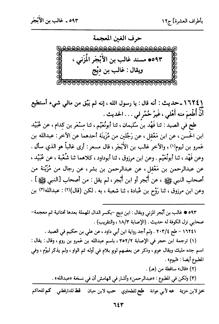 طح في الصيد: ثنا فَهْد بن سليمان، ثنا أبو نُعيْم، ثنا مِسْعَر بن كِدام، عن عُبَيْد ابن الحسن، عن ابن مَعْقِل، عن رَجُلين من مُزَينَة أحدهما عن الآخر: عبد الله بن عَمرو بن ليوم، والآخر غالب بن الأَبْجَر، قال مسعر: أرى غالباً هو الذي سأل.