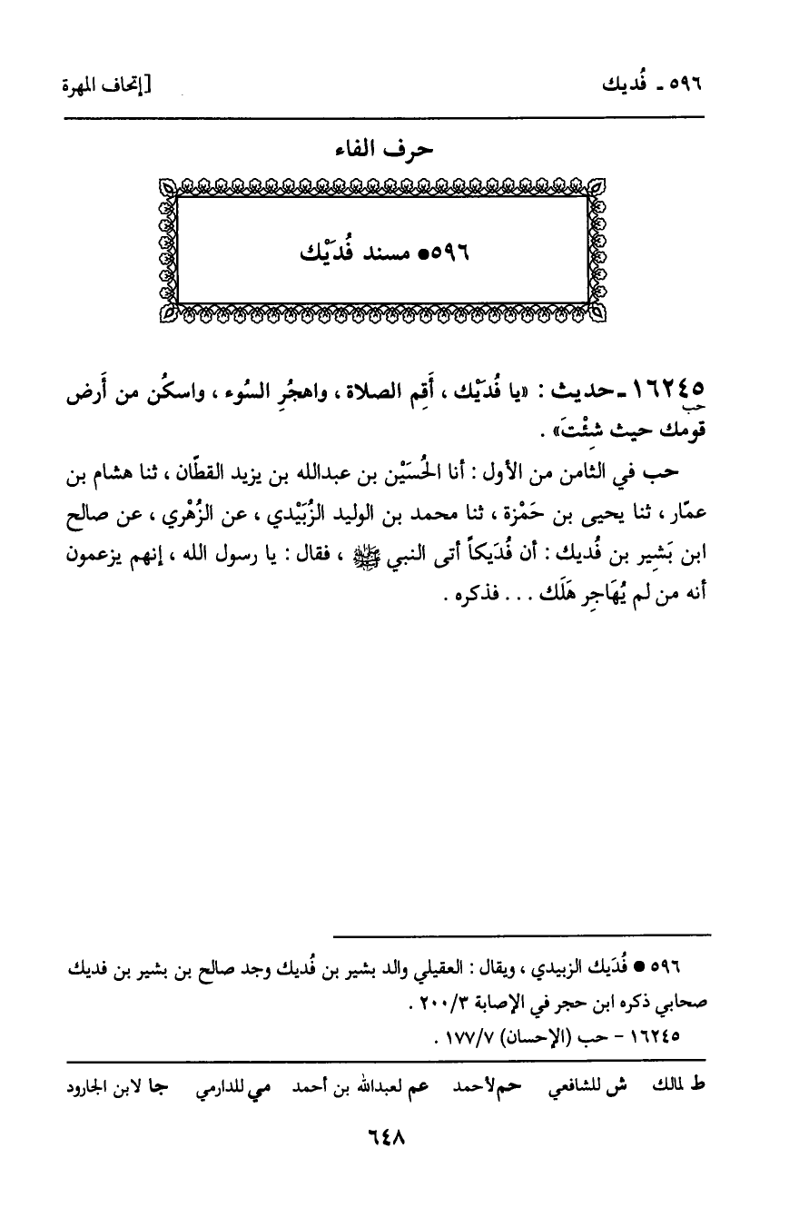 16245 - حديث (حب) : "يا فُديك، أقِم الصلاة، واهجُرِ السوء، واسكُن من أرض قومك حيث شئت".