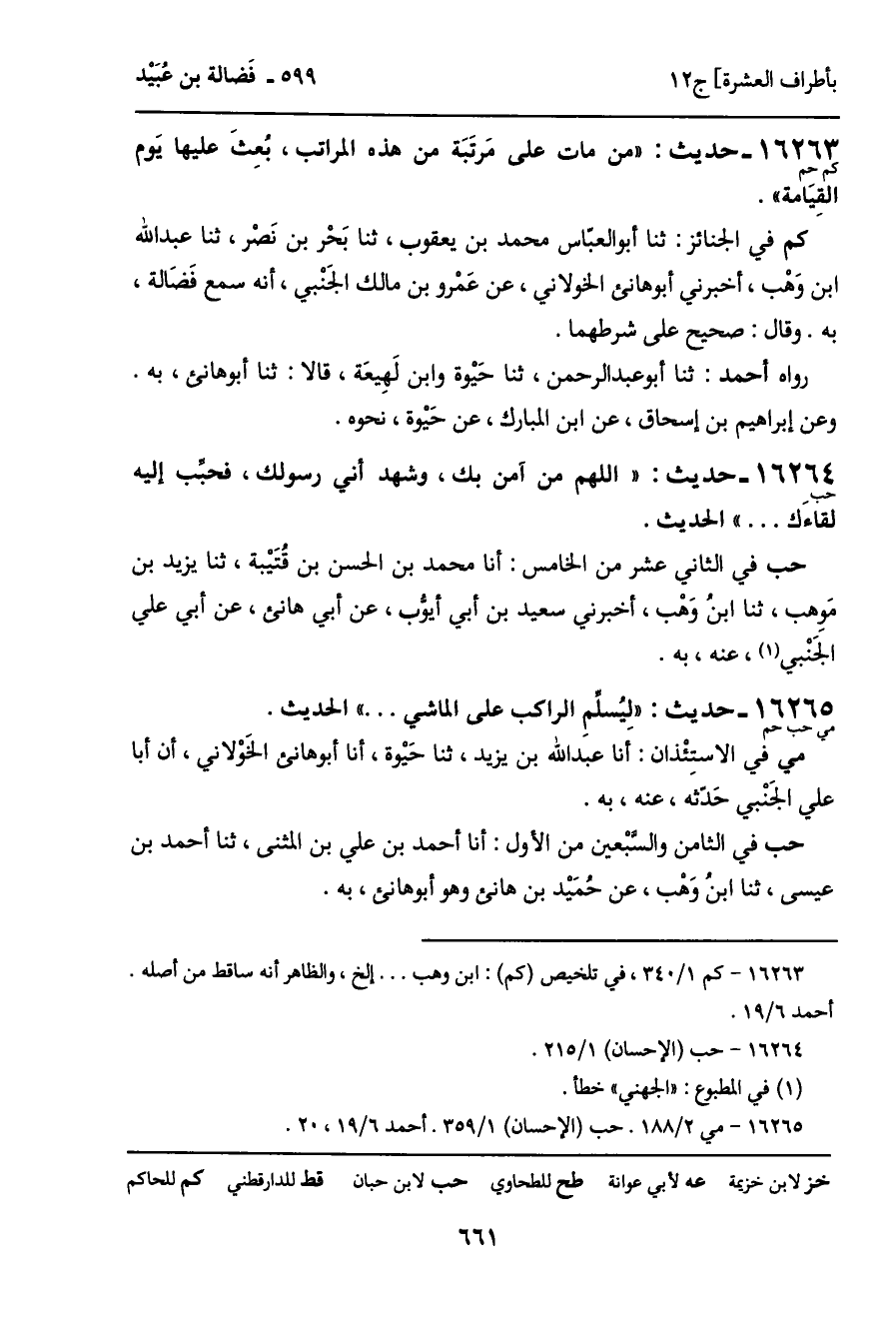 كم في الجنائز: ثنا أبو العبّاس محمد بن يعقوب، ثنا بَحْر بن نَصْر، ثنا عبد الله ابن وَهْب، أخبرني أبو هانئ الخولاني، عن عَمْرو بن مالك الجَنْبي، أنه سمع فَضَالة، به. وقال: صحيح على شرطهما.