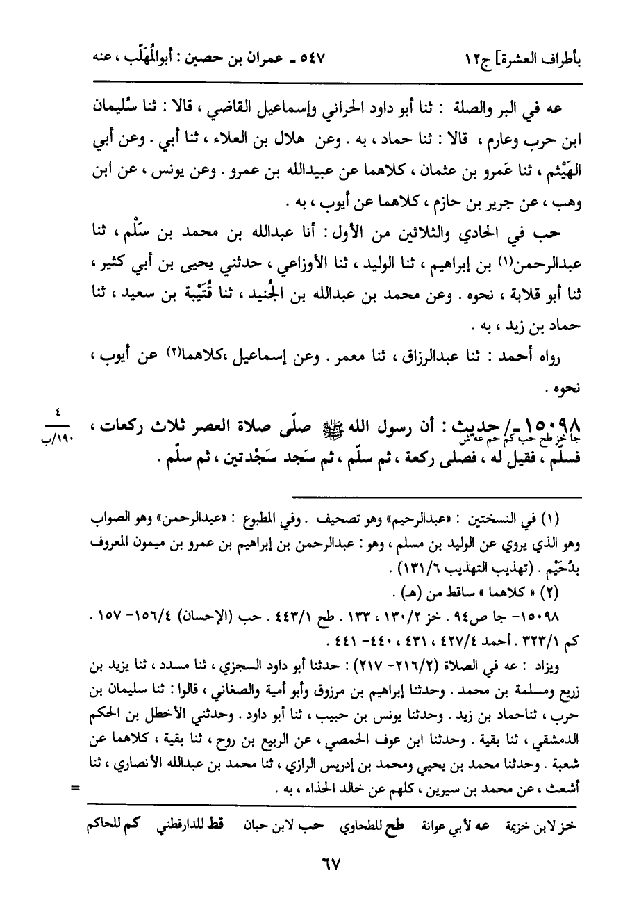 15098 - حديث (جا خز طح حب كم حم عه ش) : أن رسول الله - صَلَّى اللَّهُ عَلَيْهِ وَسَلَّمَ - صلّى صلاة العصر ثلاث ركعات، فسلم، فقيل له، فصلى ركعة، ثم سلّم، ثم سَجد سَجْدتين، ثم سلّم.