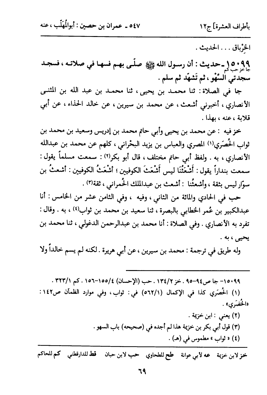 كم في السهو: أنا أبو أحمد بن أبي الحسن، ثنا محمد بن إسحاق هو ابن خُزيمة، ثنا محمد بن يحيى، به. وعن محمد بن عبد الله بن أبي الوزير التاجر، ثنا أبو حاتم، به. ولفظه: تشهد في سجدتي السهْو، ثم سَلّم.
