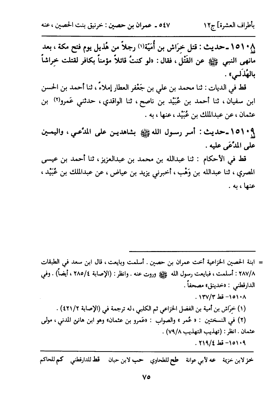 15108 - حديث (قط) : قتل خِرَاش بن أمَية رجلاً من هذيل يوم فتح مكة، بعد ما نهى النبي - صَلَّى اللَّهُ عَلَيْهِ وَسَلَّمَ - عن القَتْل، فقال: "لو كنتُ قاتلاً مؤمناً بكافر لقتلت خِراشاً بالهذَلي".