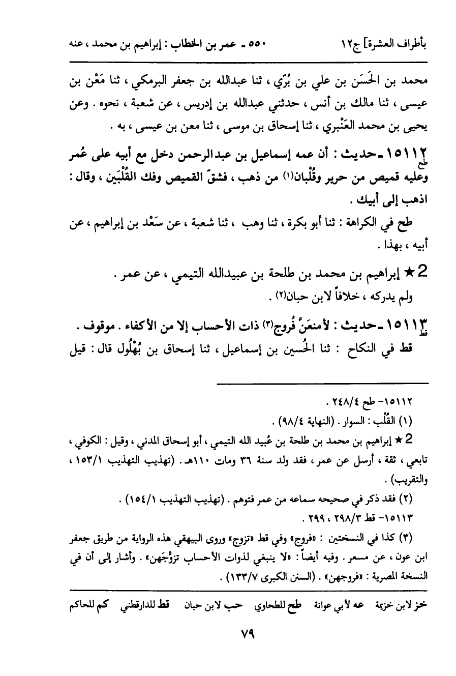 15112 - حديث (طح) : أن عمه إسماعيل بن عبد الرحمن دخل مع أبيه على عُمر وعليه قميص من حرير وقُلْبان من ذهب، فشقّ القميص وفك القُلْبَين، وقال: اذهب إلى أبيك.