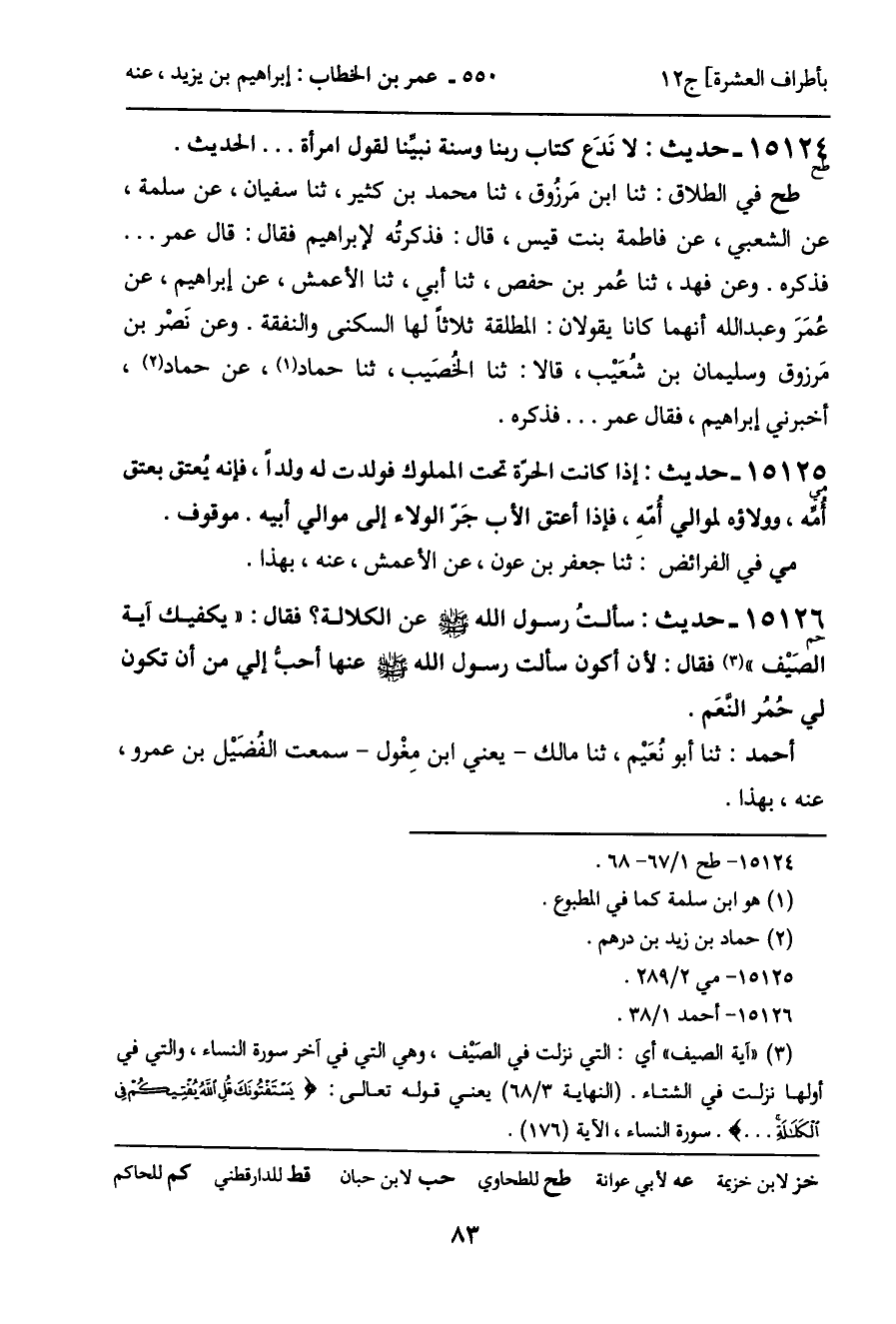 طح في الطلاق: ثنا ابن مرزُوق، ثنا محمد بن كثير، ثنا سفيان، عن سلمة، عن الشعبي، عن فاطمة بنت قيس، قال: فذكرتُه لإبراهيم فقال: قال عمر ... فذكره. وعن فهد، ثنا عُمر بن حفص، ثنا أبي، ثنا الأعمش، عن إبراهيم، عن عُمَرَ وعبد الله أنهما كانا يقولان: المطلقة ثلاثاً لها السكنى والنفقة. وعن نَصْر بن مَرزوق وسليمان بن شُعَيْب، قالا: ثنا الخُصَيب، ثنا حماد، عن حماد، أخبرني إبراهيم، فقال عمر ... فذكره.