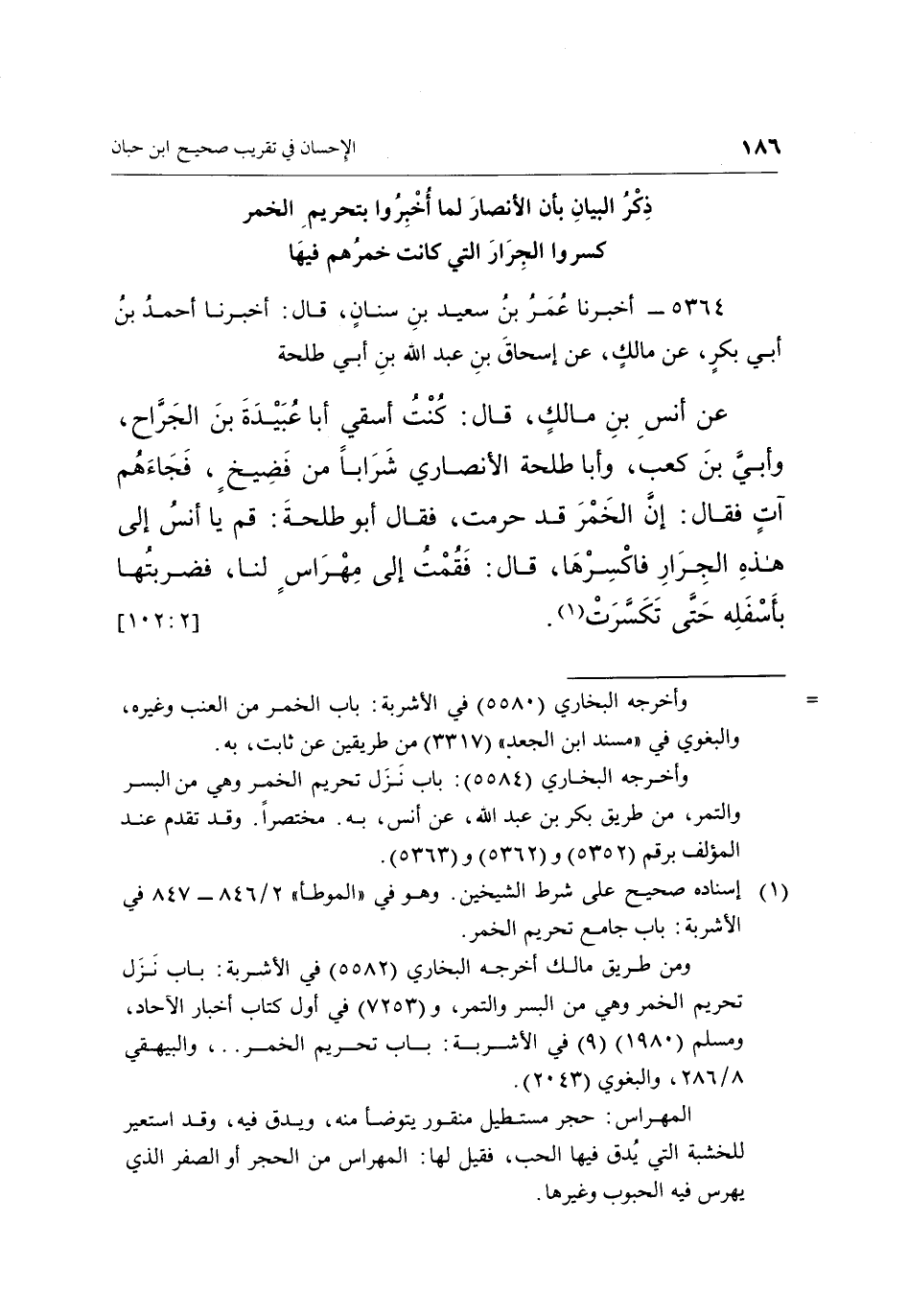 عَنْ أَنَسِ بْنِ مَالِكٍ, قَالَ: كُنْتُ أَسْقِي أبا عبيدة بن جراح, وَأُبَيَّ بْنَ كَعْبٍ, وَأَبَا طَلْحَةَ الْأَنْصَارِيَّ شَرَابًا مِنْ فَضِيخٍ, فَجَاءَهُمْ آتٍ فَقَالَ: إِنَّ الْخَمْرَ قَدْ حُرِّمَتْ, فَقَالَ أَبُو طَلْحَةَ: قُمْ يَا أَنَسُ إِلَى هَذِهِ الْجِرَارِ فَاكْسِرْهَا, قَالَ: فَقُمْتُ إلى مهراس لنا, فضرتها بأسفله حتى تكسرت 1. [102:2]
